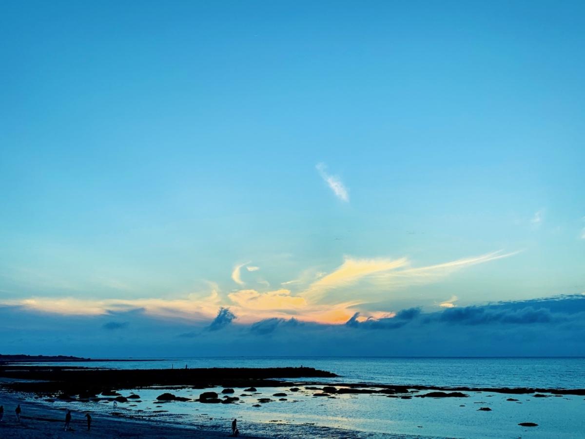 清涼而略鹹的海風將藍紫色的雲層吹低了,蔽覆了西沈的金粉。