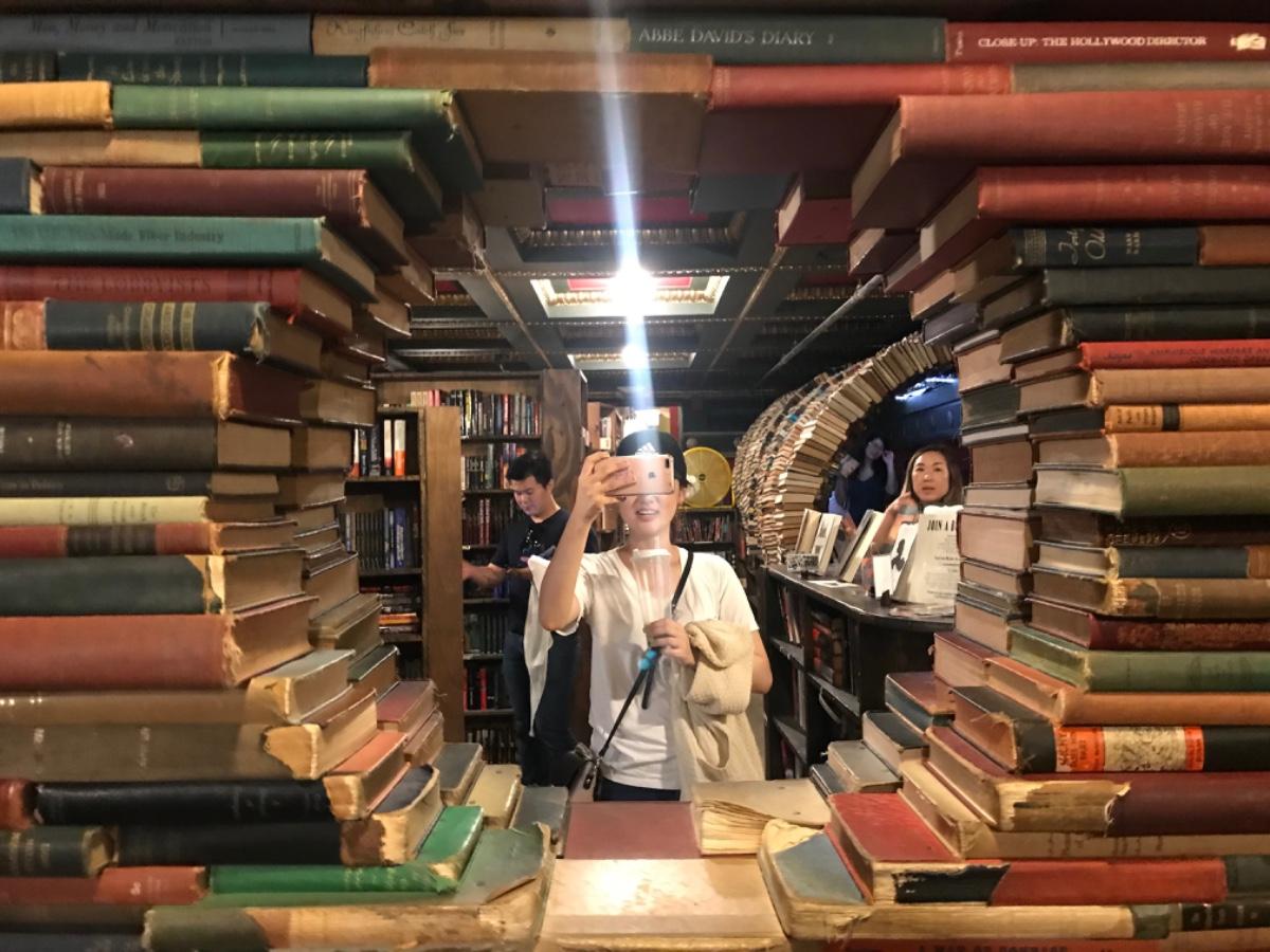 這是一個很有特色的書店,裡面有很多文創小物或藝術創作在裡面販售。最多人去裡面拍攝一個書洞,是用書堆出來的!真的很酷!