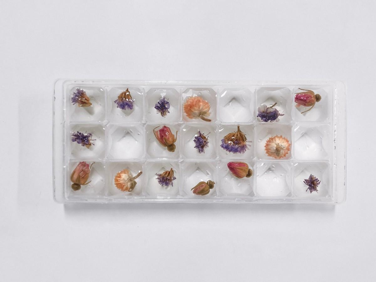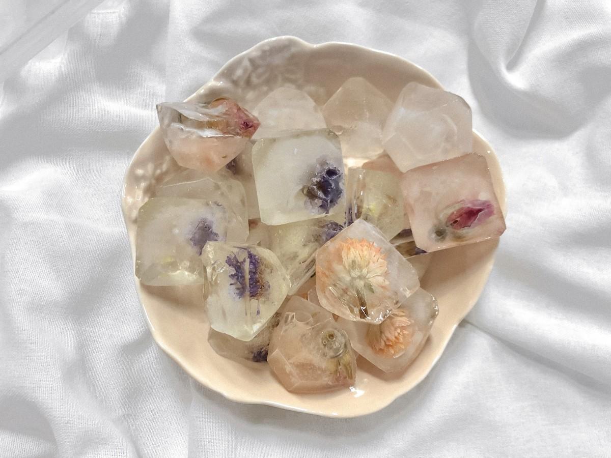 原本用途是花草茶,所以勢必會泡出有味道的茶,考慮到冰塊是拿來調其他飲品,我覺得沒有味道會比較實用,因此我先將乾操花朵泡熱水一陣子,讓花朵原來的氣味釋放出,也順便讓花朵恢復原有的柔軟狀態。將泡過水的花朵放入冰塊格中並注入水後就可以拿進冷凍,應該沒有人不知道怎麼凍冰塊吧?