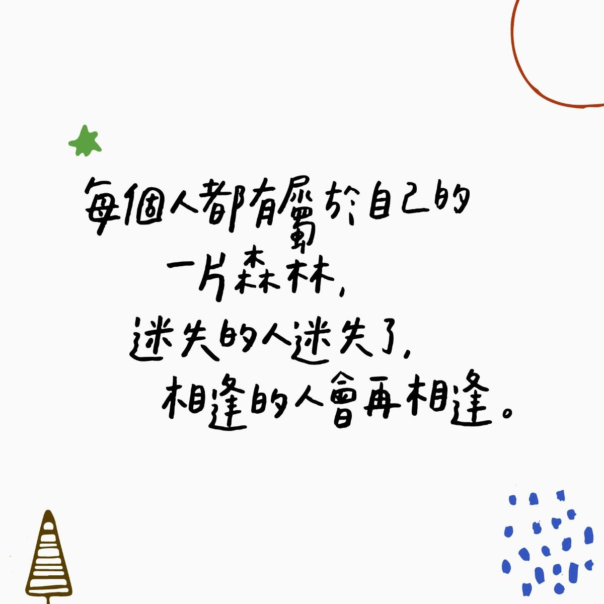 我很喜歡村上春樹小說《挪威的森林》裡的一段話:「每個人都有屬於自己的一片森林,也許我們從來不曾去過,但它一直在那裡,總會在那裡。迷失的人迷失了,相逢的人會再相逢。」