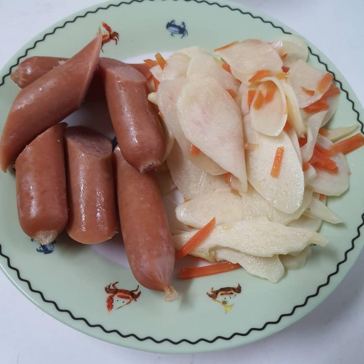 9/16 Wednesday 水曜日 PeterPenny 雙P早餐 ~五穀飯+韓式海苔酥,筊白筍,德國Q肉丁香腸。 前一晚先備料,今早10 分搞定,炒菜,燙個香腸很快就完成。 最愛Q肉丁香腸的口感,QQ好好吃。 #雙P早餐 #德國Q肉丁香腸 #韓式海苔酥