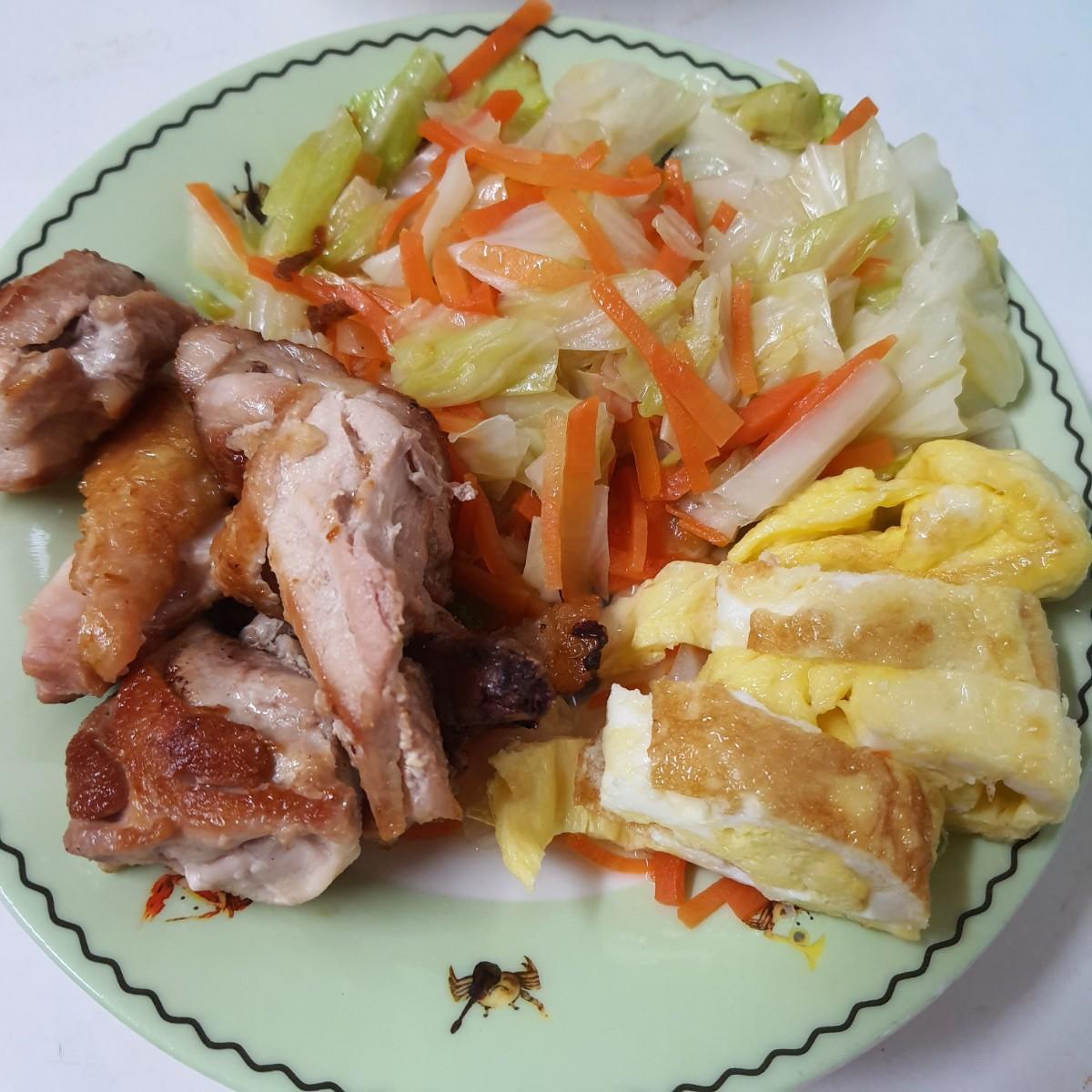 9/21 Monday 月曜日 PeterPenny 雙P早餐 ~五穀飯,清炒高麗菜,煎雞腿排,蛋捲。 今日玉子燒是鹹的口味,明天要來試做日式甜甜的玉子燒 #雞腿排 #玉子燒 #雙P早餐