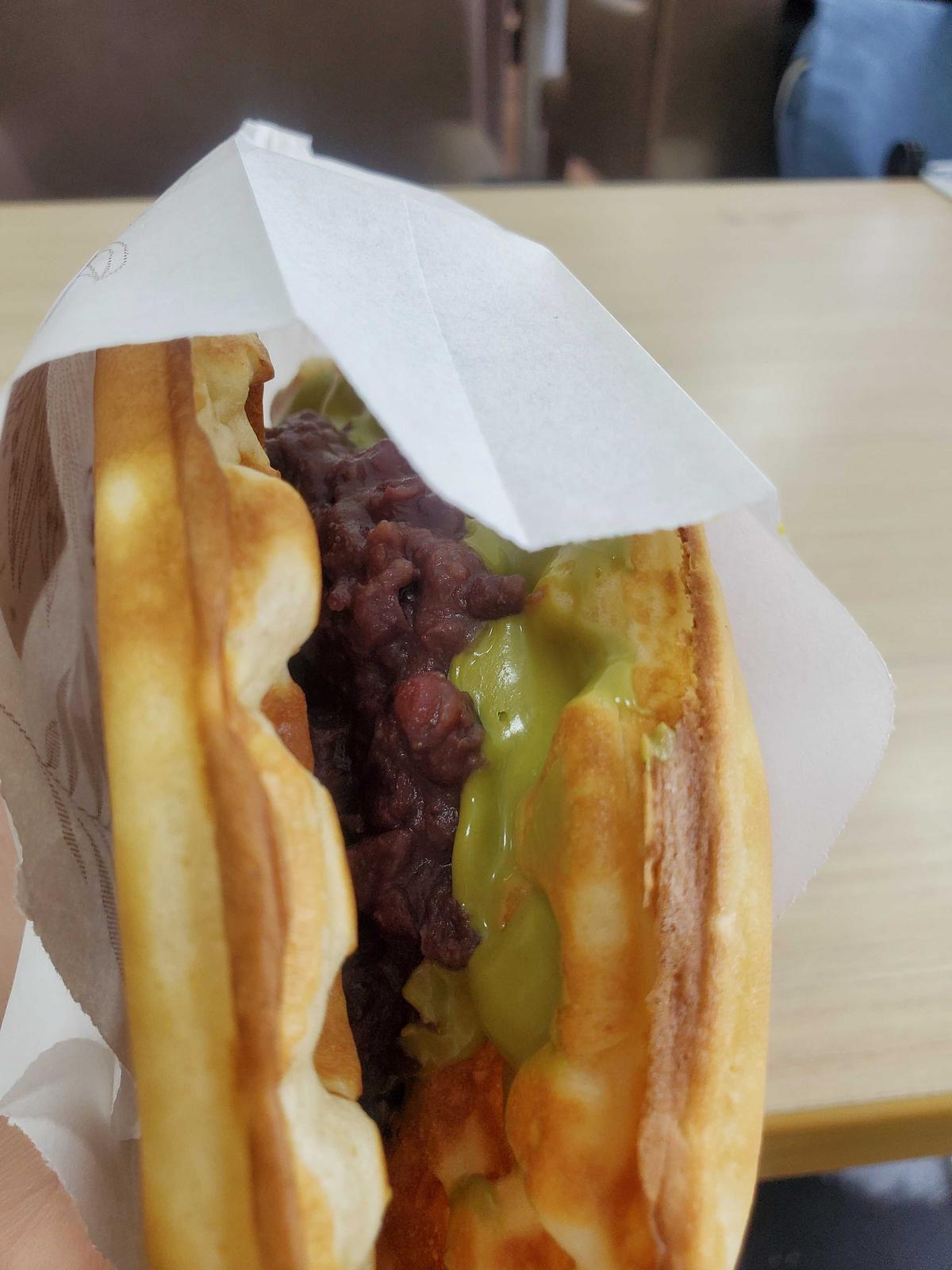 抹茶醬不會太甜、紅豆給得大方,整體的味道是好吃的😋但我那天沒有點飲料,吃到後面感覺有點乾,建議點這款的話還是要搭配一杯飲料喔~
