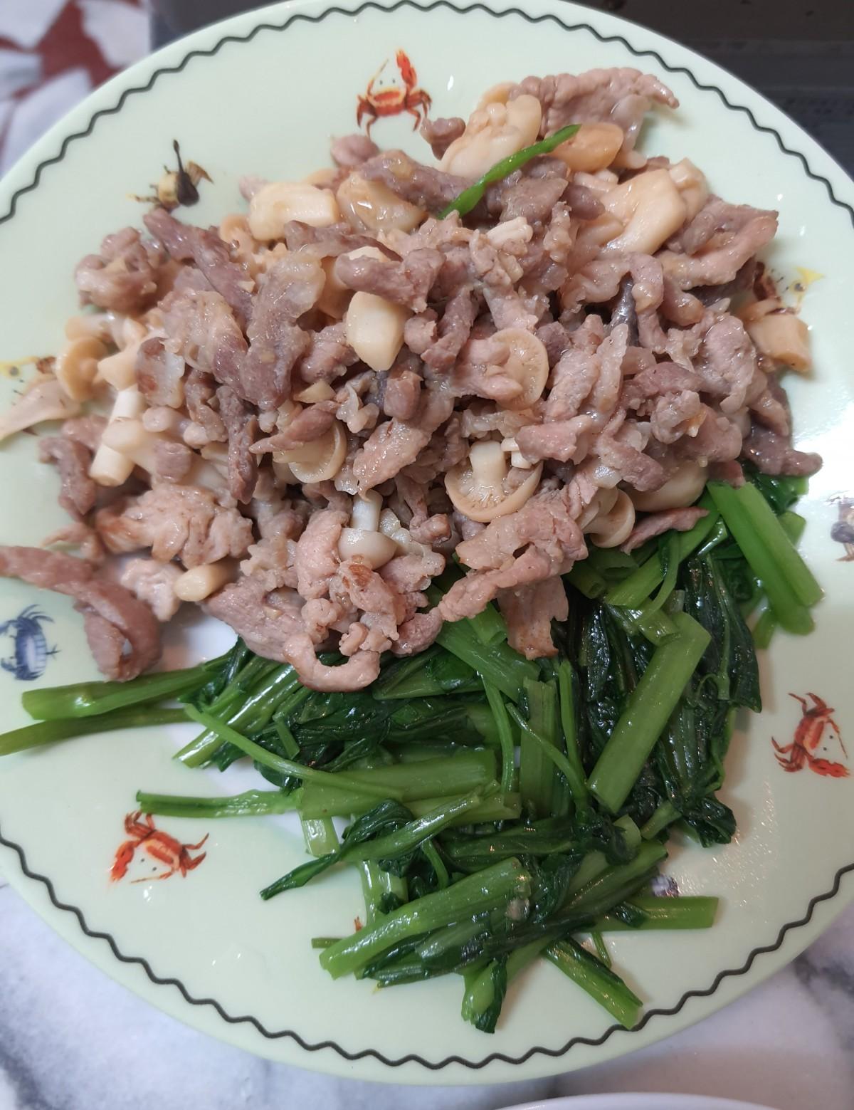 11/16 Monday 月曜日 Peter Penny 雙P早餐 ~菇菇肉絲,空心菜,白米飯 醃漬肉絲一晚,隔天一早與雪白菇一起拌炒 下飯小幫手,完食。 #雙P早餐