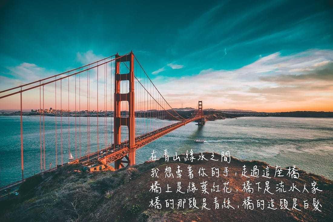 有人說,愛一個人,就要把他當作全世界,但我說,愛一個人,就要跟他一起漫步全世界。一起走過不同風景,一起遙想未來,一起把握當下,一起走過那座橋。