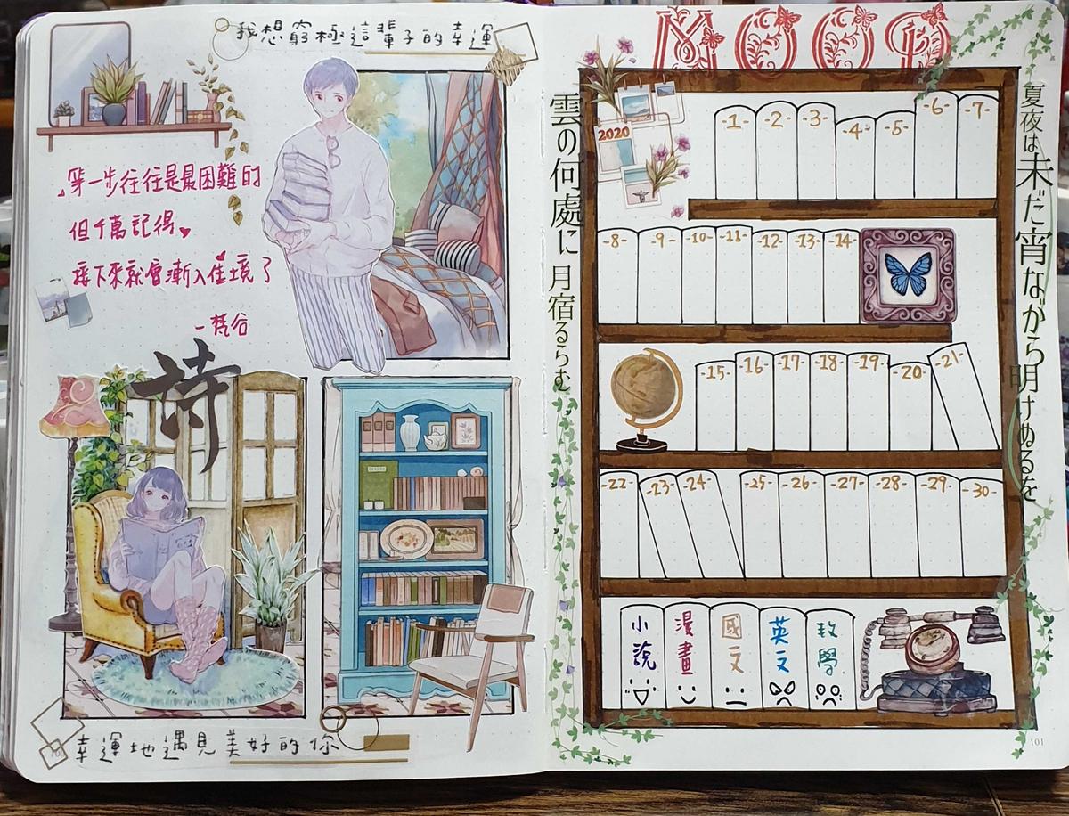 最近子彈筆記都沒啥再拼貼🤔 果然是追求太高…腦袋跟不上嘛? 而且靈感時有時沒有的 也是很煩… 我很喜歡這篇書櫃寫起來的效果🤭🤭 感覺很棒~ 但就是…很麻煩!!!!!!!