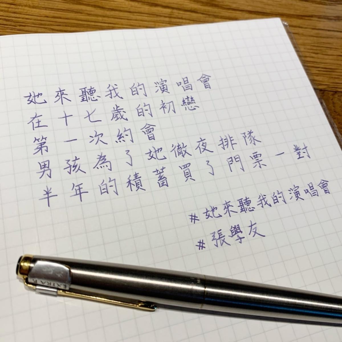 今天所用就是派克50。整體鋼尖加上它的筆型,其實沒什麼彈性可言,所以寫來蠻像在割紙的。而它筆尖鍛造的形狀,只能說是個出墨順暢的極細尖吧。