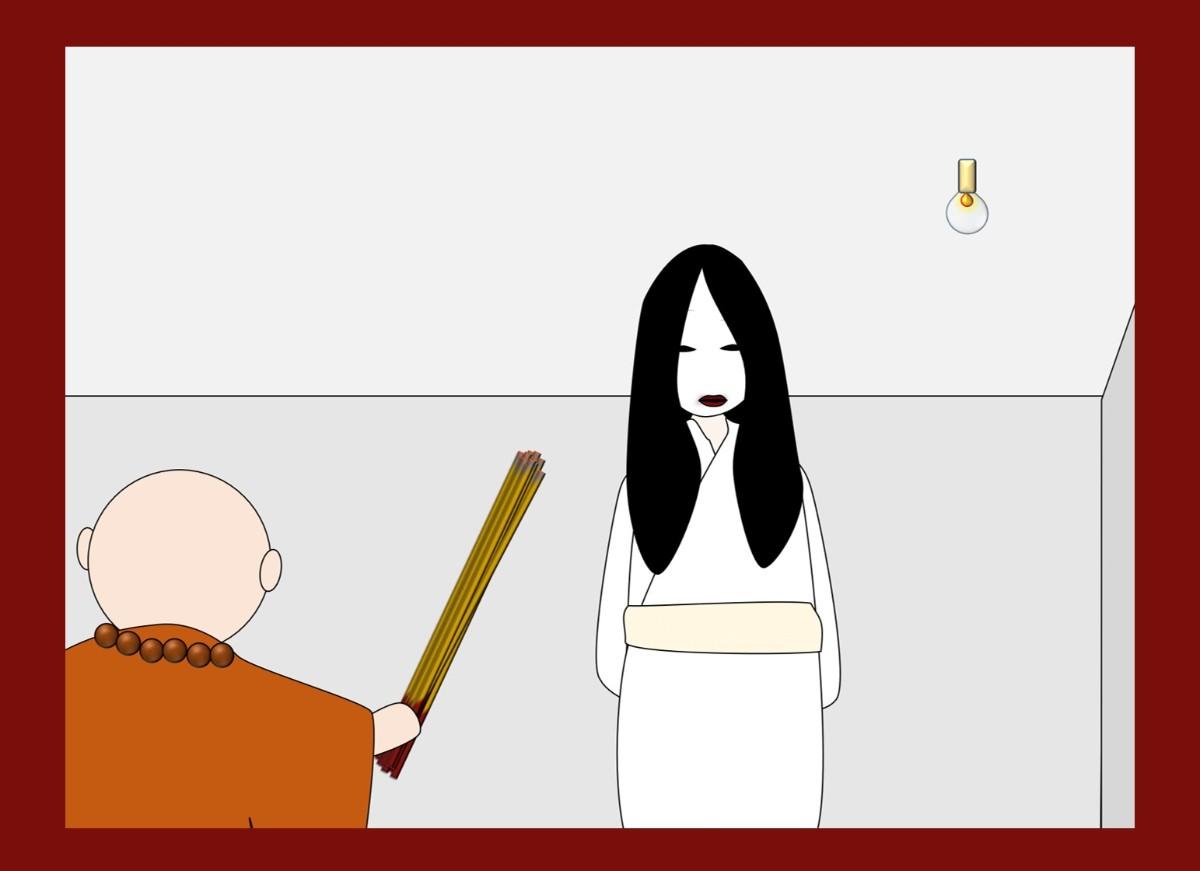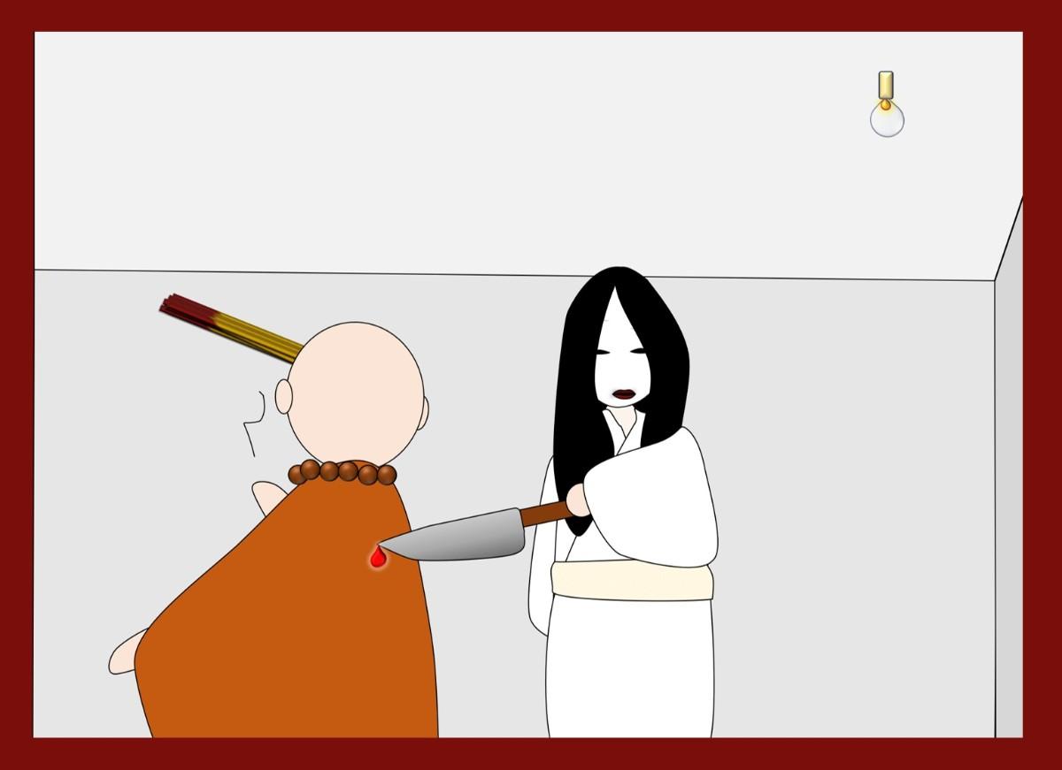 想當然爾,根本沒用,因為進來這兒打擾人家,人家當然不爽,所以被女鬼反撲,拿著片頭切肉的刀子捅了得道高僧一刀。