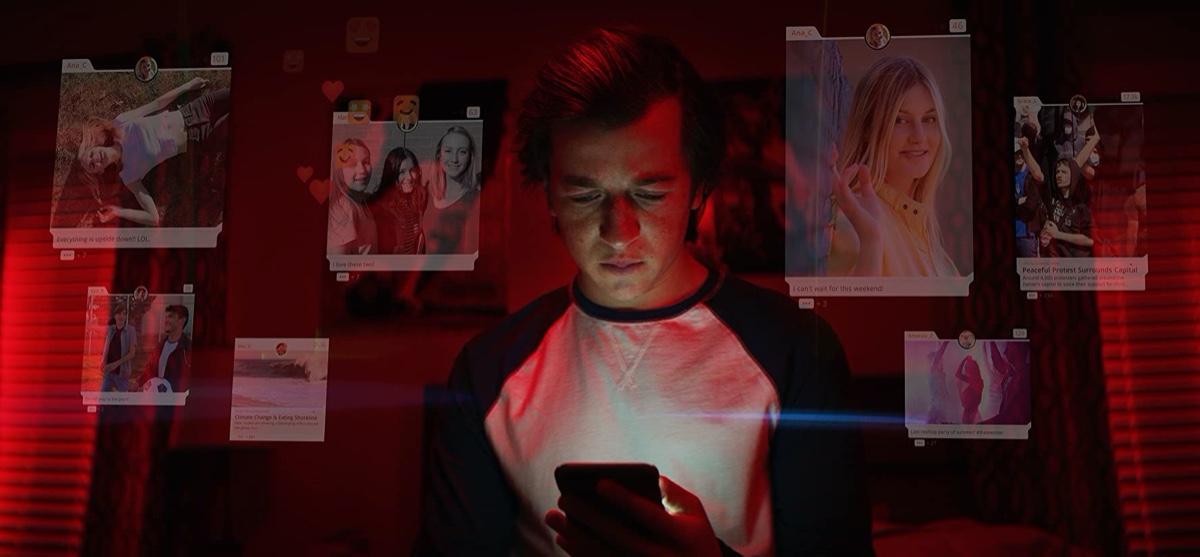 不過這些聳動的事實,還不是《智能社會:進退兩難》最大膽的設計,導演Orlowski還在之中穿插了一則虛構的故事,以電影戲劇的拍攝手法,加強了主題本身的戲劇性與親民性,呈現一位平凡的年輕人如何透過Facebook的影響,無形之中漸漸走向穆斯林仇恨團體的活動。這個虛構的劇情,聚焦於一個美國的中產階級家庭,Ben (Skyler Gisondo飾) 是一位沈迷於手機的典型高中男孩,而在虛擬的世界中,Vincent Kartheiser飾演的「演算法」負責餵養Ben內容,讓他放不下手機,他的姊姊 (Kara Hayward 飾) 則是相當擔心他的手機成癮。我們看著「演算法」如何在後端以各種方式推廣Ben推文內容,透過Ben的反應回饋,進行廣告競標,顯示廣告於Ben的眼前,再透過ben的反應修正…,反覆的過程之後,「演算法」基本上已對於Ben瞭若指掌,預測也愈來愈精準,而Ben也因此更加陷入其陷阱之中。