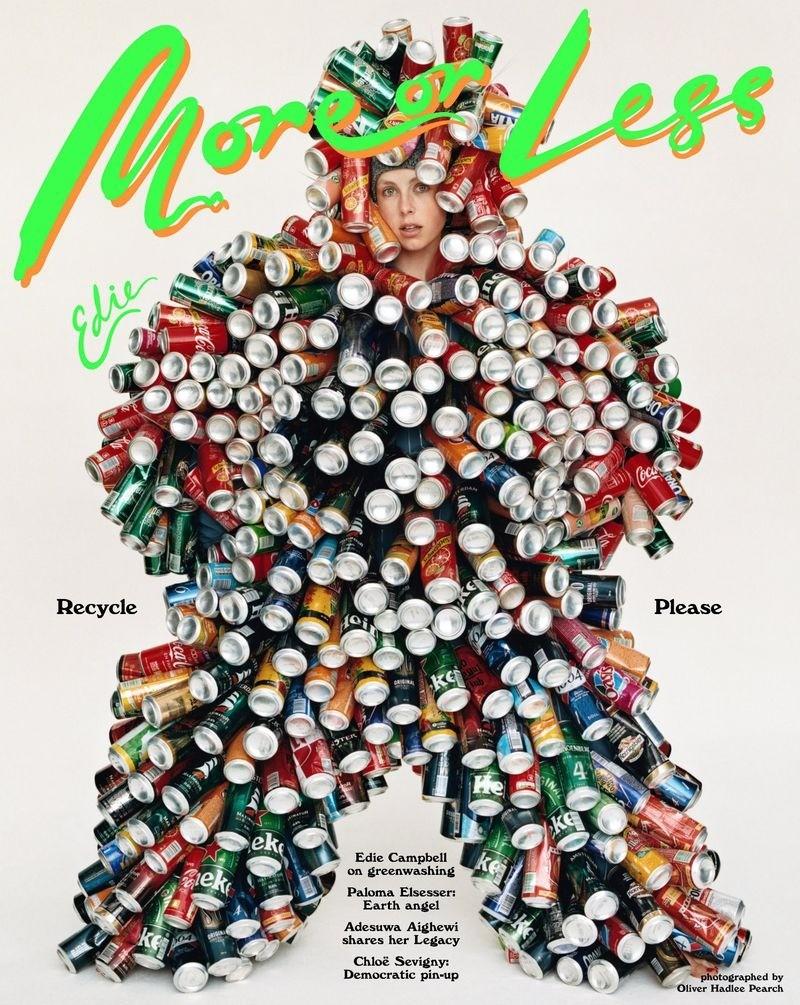 時尚雜誌More or Less 2020年秋冬號推出四款封面,其中一款是英國名模Edie Campbell穿上KEZAKO品牌所製作的飲料罐連身裝。