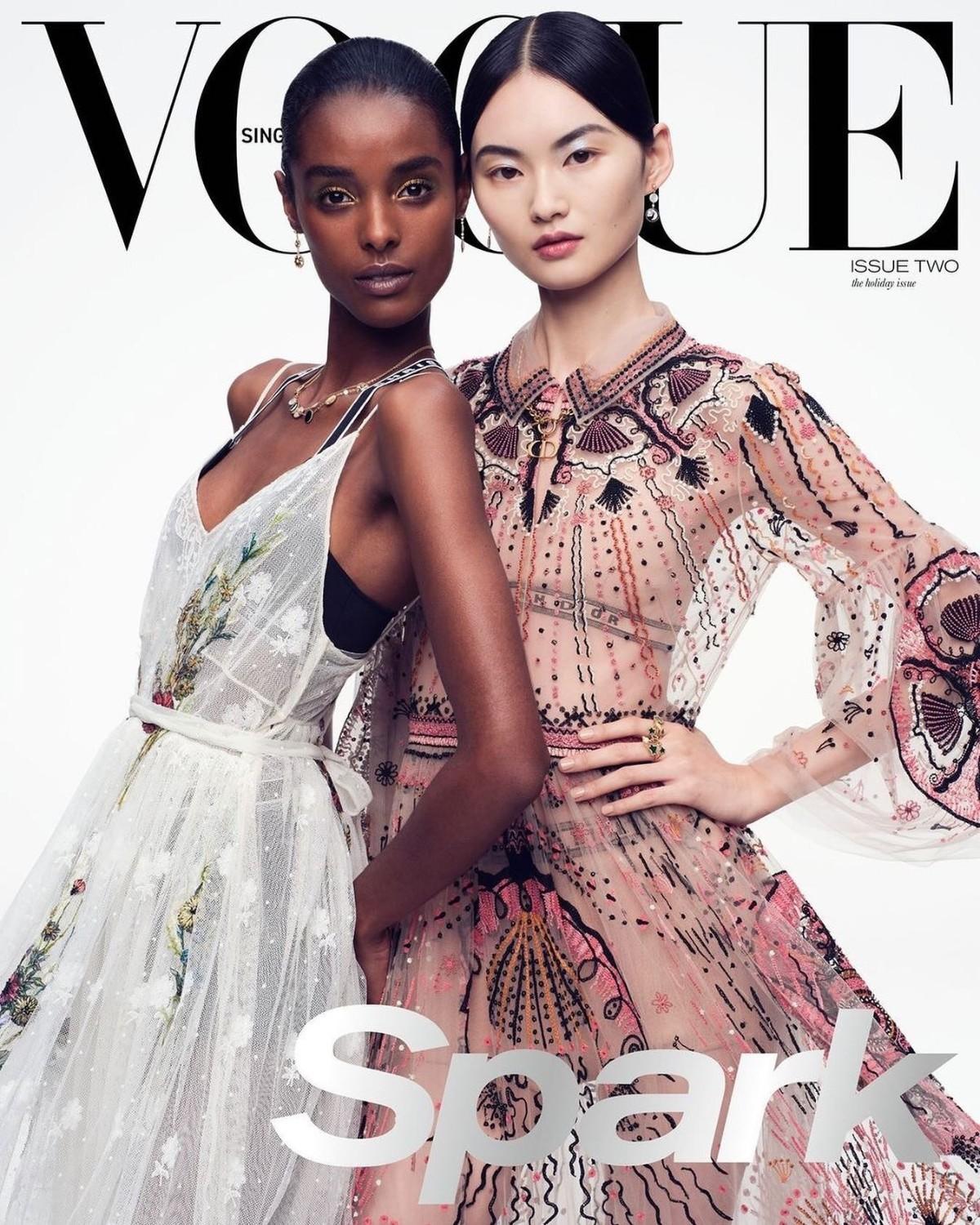 Vogue新加坡版2020年12月/2021年1月號封面,邀請到中國女模He Cong及吉布地嫩模Malika Louback一起穿上Dior充滿節慶感的禮服。