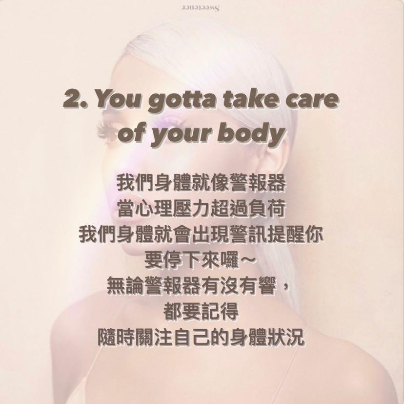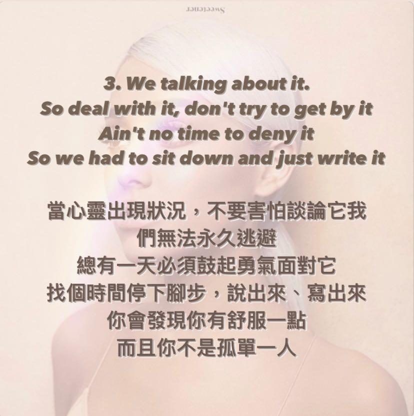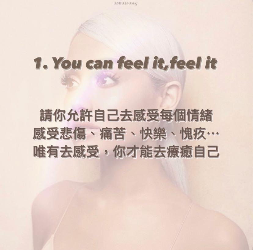 我真的要強調:這首歌歌詞真的很棒,充滿了同理心和陪伴的力量,還有對心理健康的重視❤️很多人遇到壓力或挫折,身邊的人會說:「趕快振作起來!」、「加油呀」、「你怎麼還沒好?」⋯他們不知道這些話就像刀,一劃一劃讓心靈的傷口越來越深,這邊我想分享Ariana在Get Well Soon中傳達的5個心理健康概念(包含我的自我詮釋):
