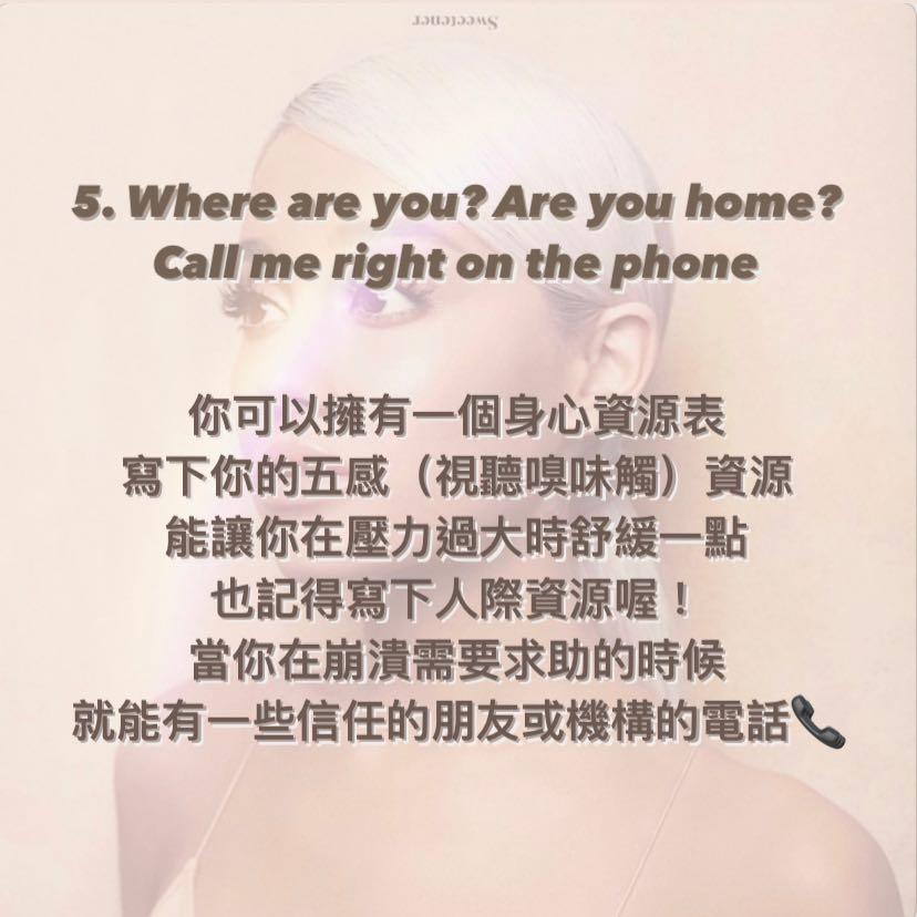 每個人都可以擁有一個身心資源表,除了寫下你的五感(視聽嗅味觸)資源,能讓你在壓力過大時舒緩一點,例如:音樂、絨毛玩偶、玫瑰茶⋯也記得建立人際資源喔!這樣當你崩潰需要求助的時候,就能有一些信任的朋友們或機構的電話📞