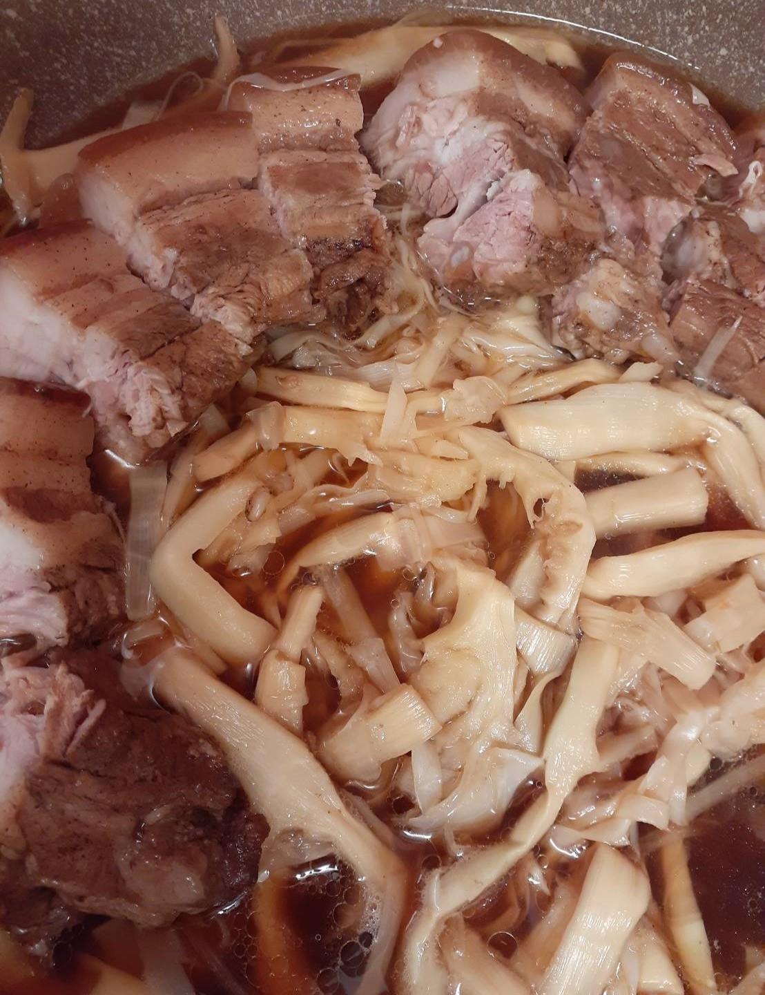 大部份做筍絲焢肉都是以五花肉川燙後切塊就直接入鍋炒再加入筍絲開始悶煮。我把五花肉先用再煮鍋處理多了一道程序,是比較費工些。然而,用再煮鍋處理過的焢肉能做到入味又入口即化,此時在換鍋加入筍絲悶煮少許時間讓筍絲保有脆甜而不爛。