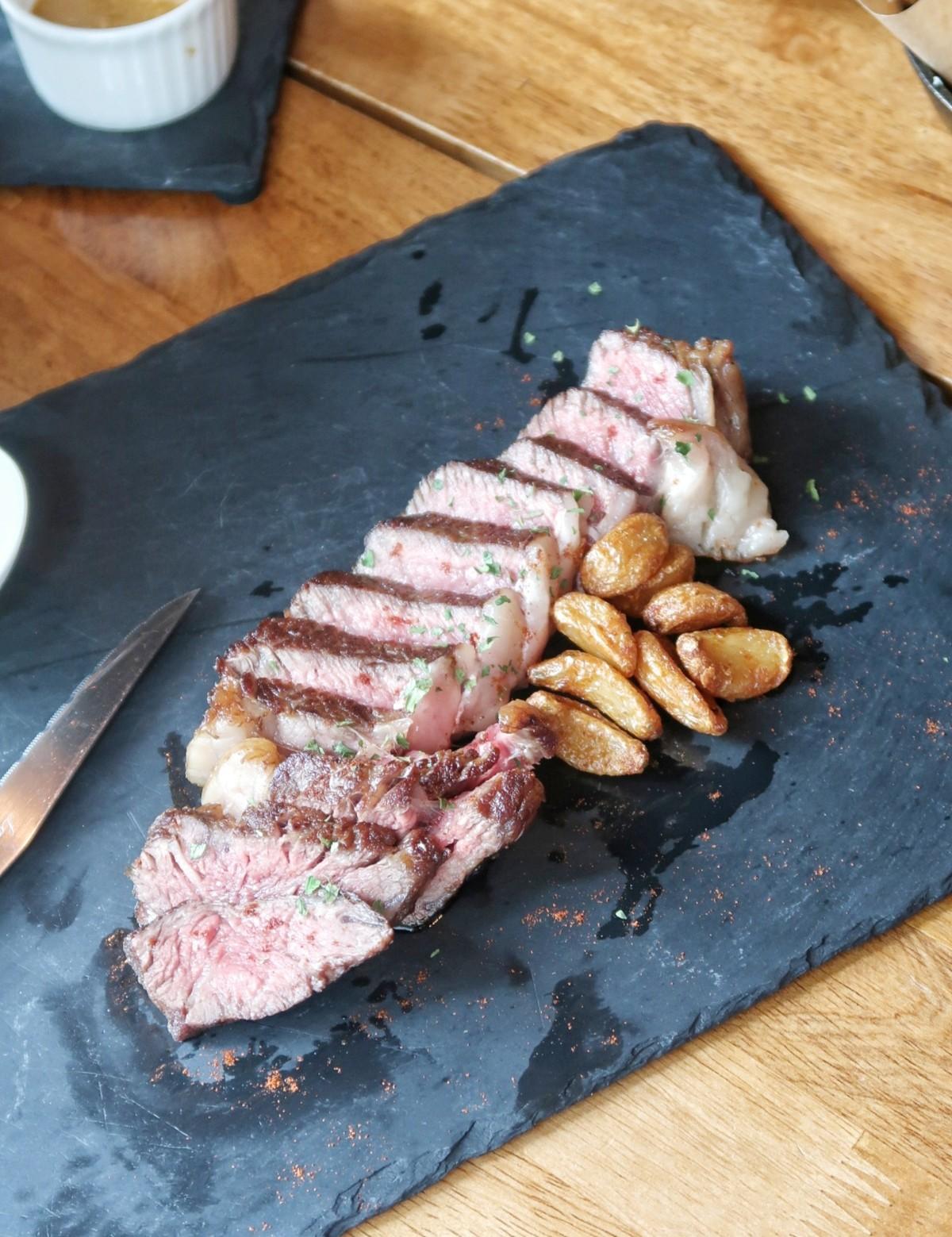主餐肋眼牛排店家建議3-5分熟,5分熟非常剛好,嫩中帶點口感好咀嚼。飯食推薦頂級鴨肝半磅紅酒燉黑豬肋眼飯,豬肋眼有點像是帶點肥肉的松阪豬,屬於比較需要咀嚼的肉但我非常愛這個。大人的熟成咖哩除了基本的咖哩醬以外還加了紅酒、蕃茄及其它店家秘方下去燉煮,會帶點酸酸的口感,但我比較吃不習慣但不會不好吃!