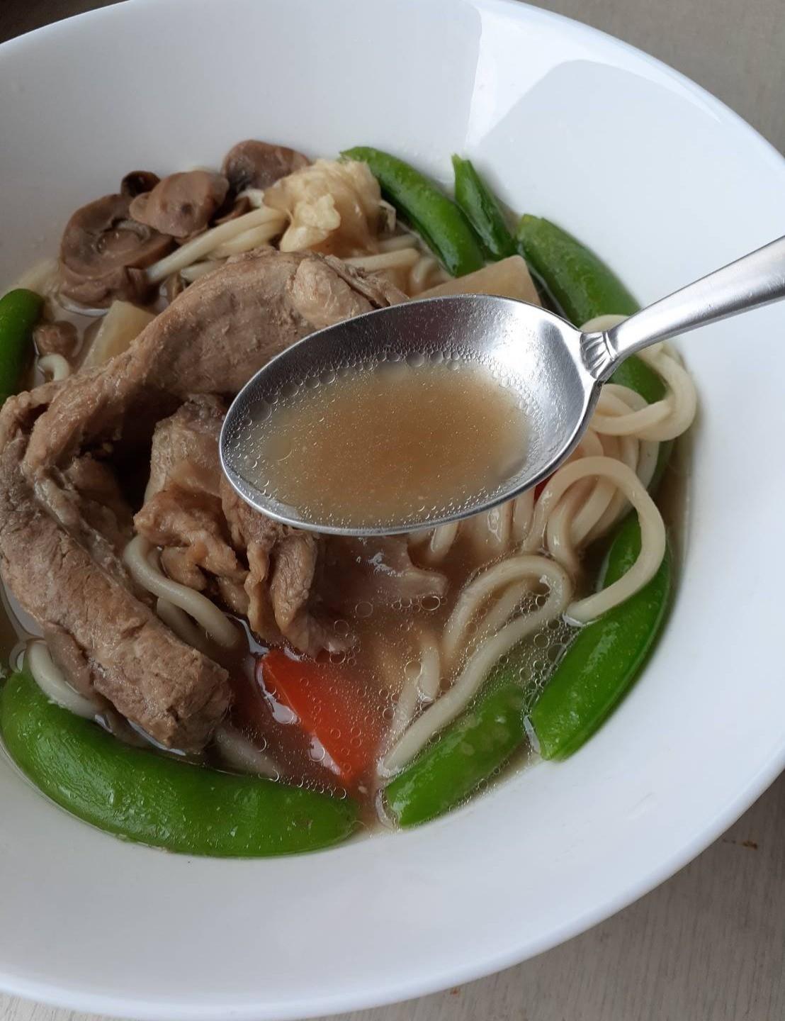 《築水引》帝王養氣肉骨茶麵條用的是中細麵,這樣的麵條好吸湯汁,肉呢?肉是真實的大塊肉,大塊到我拍照時根本夾不住。湯頭是能喝到多種肉骨茶配方層次的濃郁湯頭,又經過熬煮這湯頭融合了藥材跟豬排骨真的是好味道....濃郁湯頭閃著自然豬肉油脂。