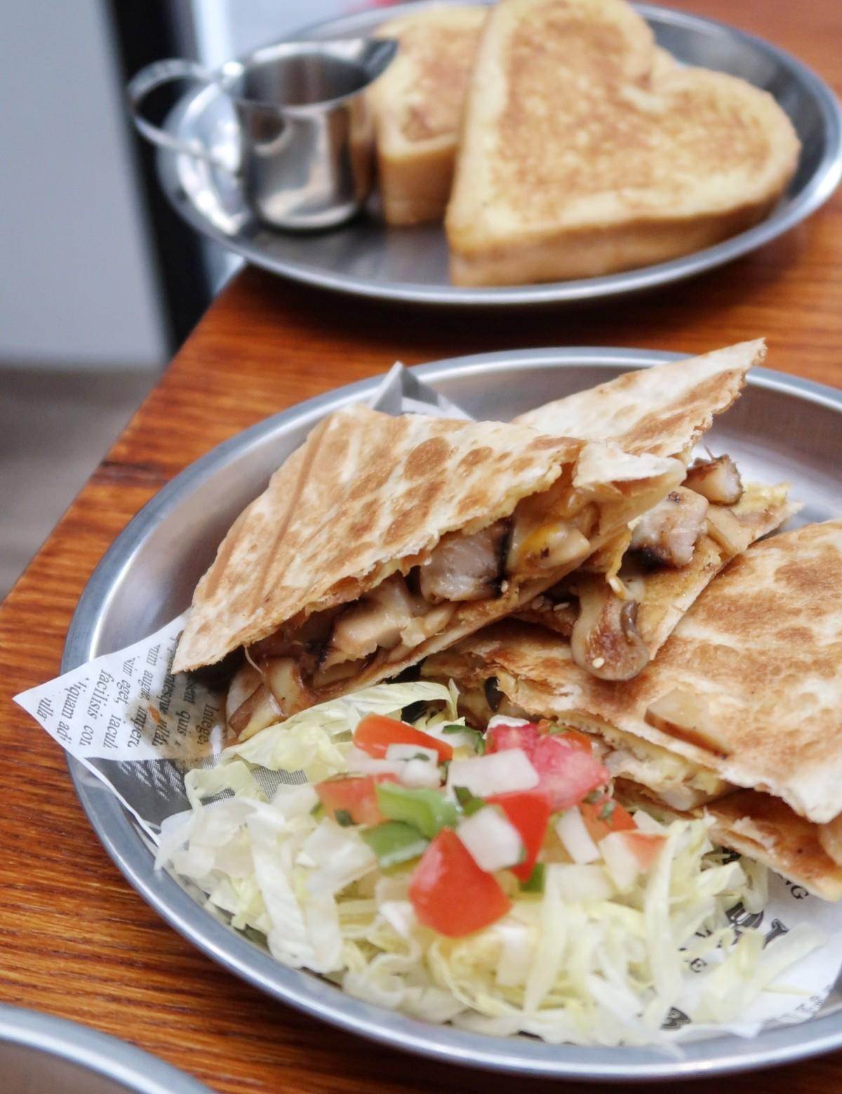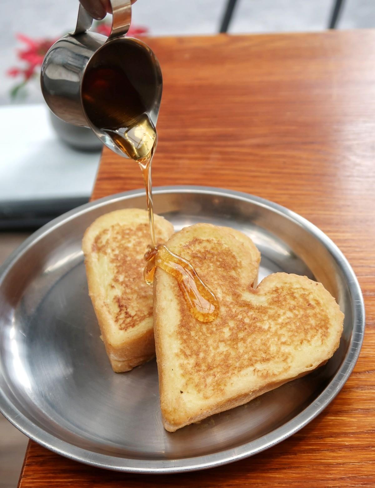 店家自製的手打牛肉漢堡排搭配泡菜、起司及生菜,在濃郁的味道中帶點清爽,是我當天吃完心中最喜歡的一道☺三明治莎莎雞腿較清淡沒有太凸顯的味道所以比起牛肉堡表現得就比較普通一些。照燒菇雞酥餅也是我很喜歡的一道輕食,先醃漬過的照燒菇雞在下去煎,不僅香氣十足,酥餅酥脆。旁邊有些許沙拉上面的青椒跟蕃茄都有釀漬過所以非常解膩🤤愛心形狀的法式吐司光看都覺得可愛,奶油香氣四溢外脆內軟,淋上楓糖很適合當餐後甜點。飲品海鹽奶蓋系列都很推薦,鹹甜滋味與咖啡或低甜度紅茶搭配得宜。