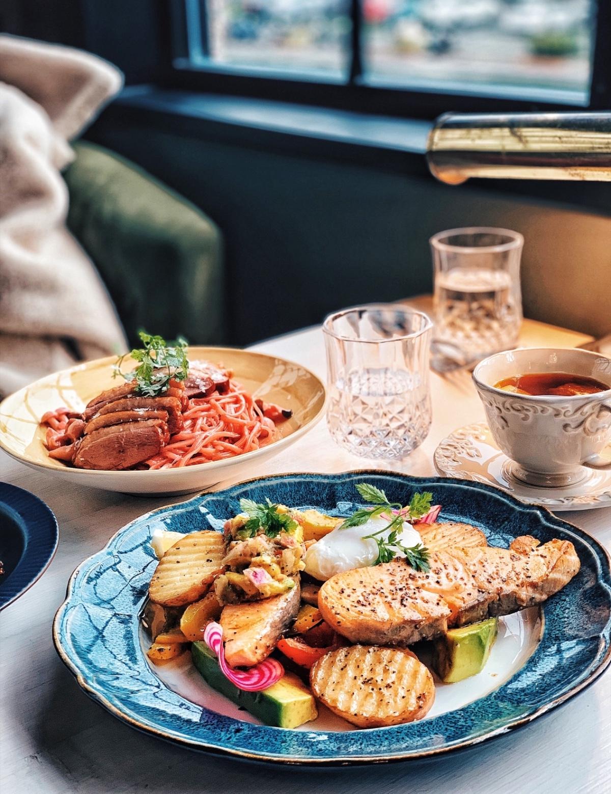 中午餐點種類多樣,有早午餐、有鬆餅、也有義大利麵或燉飯等餐點供選擇。猶豫了一萬年(笑,決定選下煎鮭魚配馬鈴薯與蔬菜套餐。