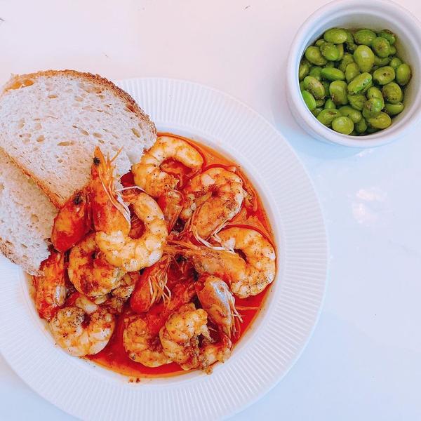 海鮮有蛤蜊、小卷及三隻鮮蝦,蝦子很貼心的已經去殼剩頭尾,蝦頭的尖刺的地方也有做處理超貼心❤️吃起來方便許多,蛤蜊十分多汁,整體來說海鮮都非常新鮮!😍