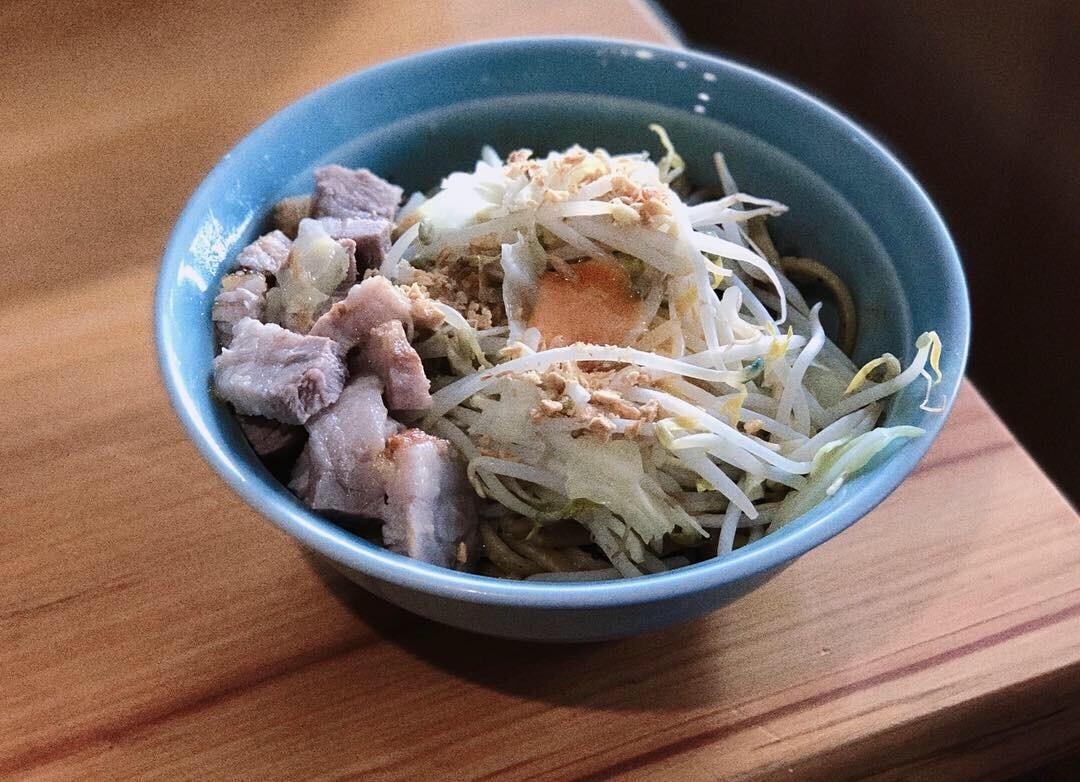 將軟嫩帶油花的切塊厚叉燒、蔬菜、麵條上下攪拌,配上滑嫩生蛋黃、炸蒜酥、起司,濃味的調味醬汁與背脂香氣堆疊出油鹹油鹹的口感,真的好好吃。
