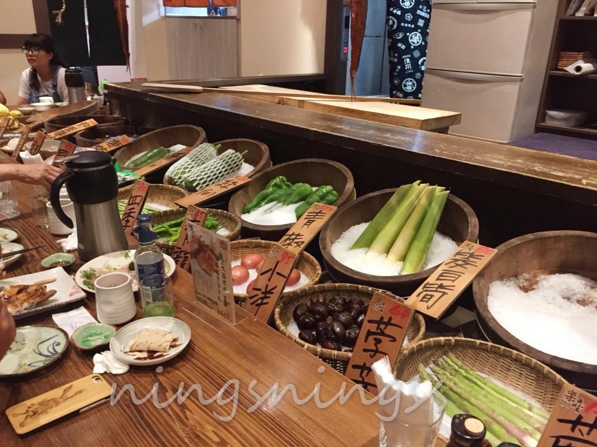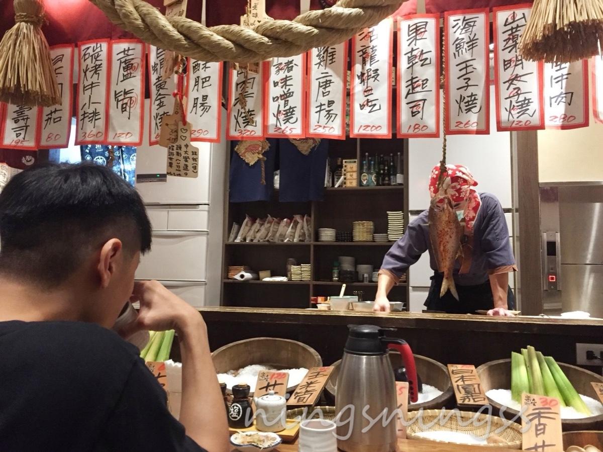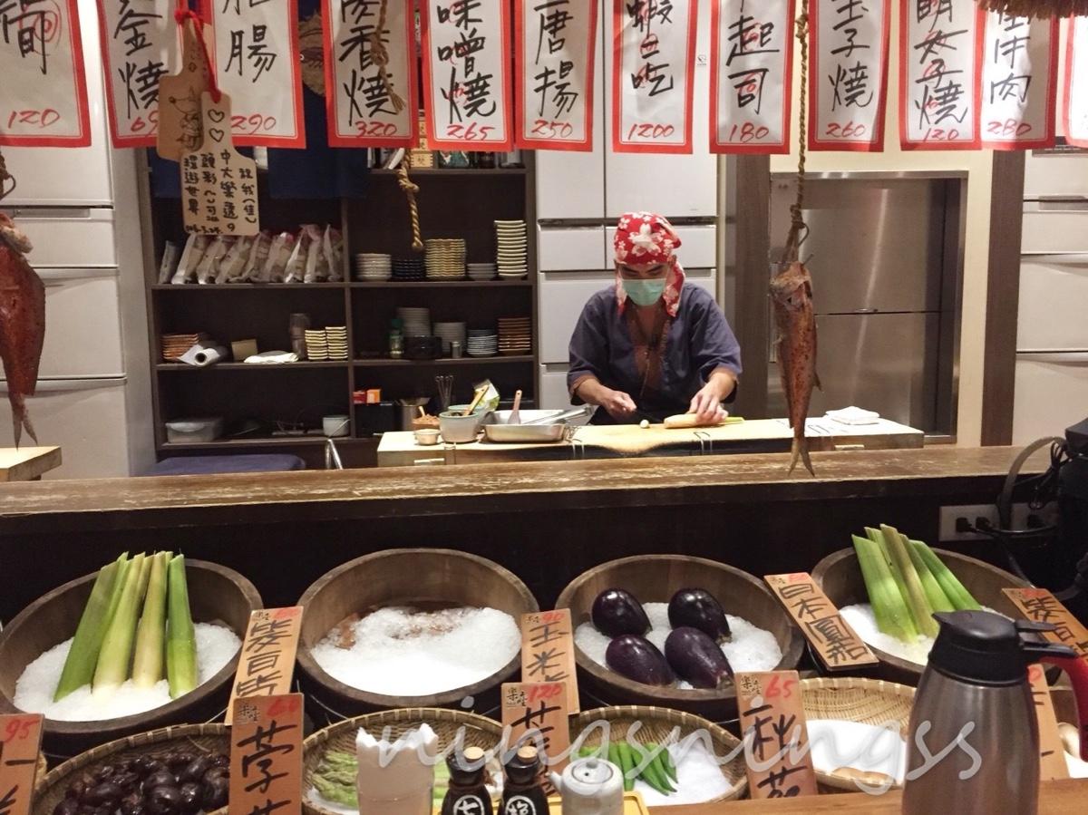 而吧檯座位區的前面就是擺放的食材,上頭也有手寫菜單,寫著今日出餐的餐點,有時候雖然自己沒有點那樣食材,但是看著師傅在面前料理,常常都會被吸引,又在做出加點的動作😛