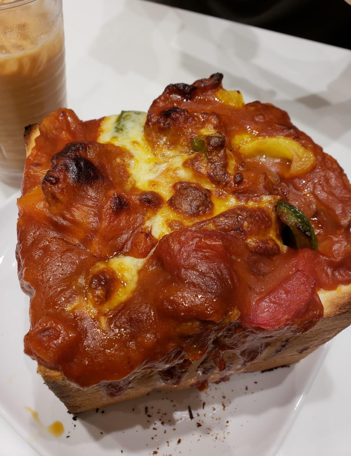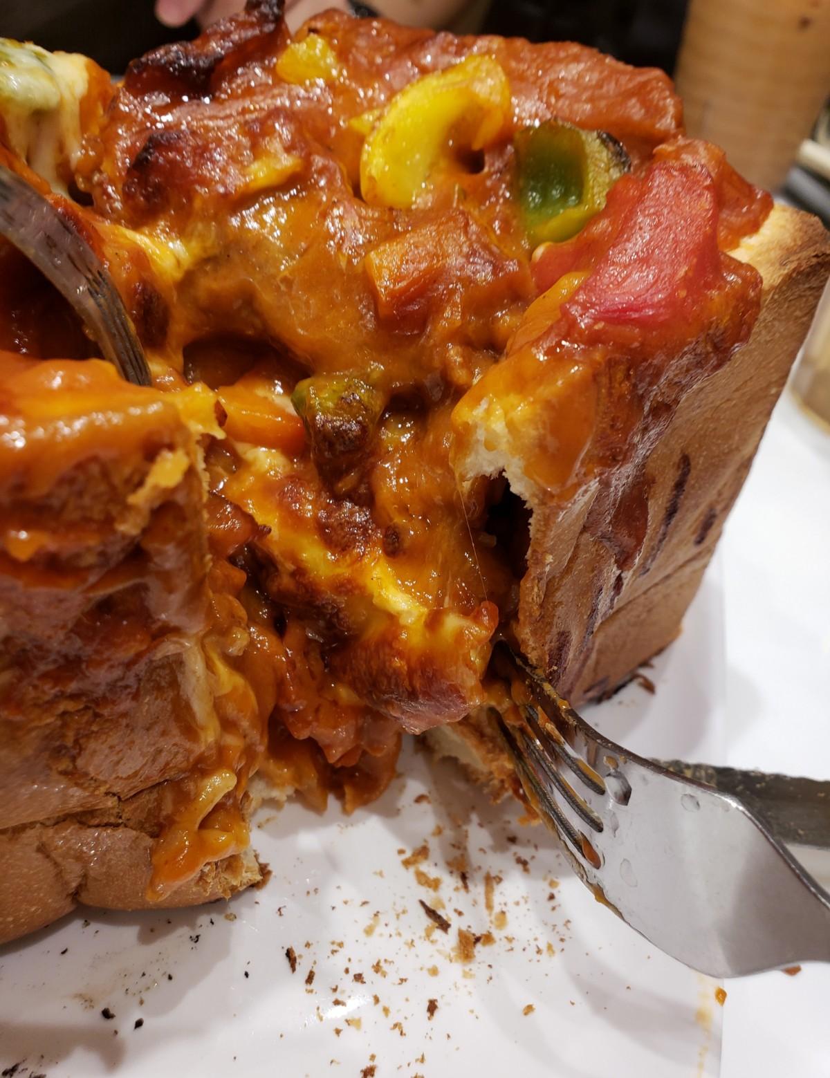 還好可靠的永興冰室有營業!所以就進去吃了好久沒吃的炸牛排,和焗茄汁豬扒多士盒。上次吃了咖哩的,這次吃茄汁的,我投茄汁一票,但是老公覺得麵包的部分配上咖哩更美味。多士盒裡面裝的是...蛋炒飯!所以說,如果是兩個胃口沒有特別大的人,可以兩人點一個就很夠吃了。店家一人低銷是$18港幣,點一個多士盒餐+一個單點飲料就沒問題了。
