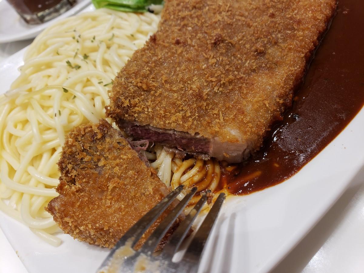炸牛排我還是覺得要吃這種的!日式炸牛排,牛肉偏軟嫩油脂豐厚,而且一般會切片,送到桌上,要自行再加熱。可是這家的牛排走的是紮實口感,整塊炸完,自己切塊。肉雖然不是嫩軟,但是我反而比較喜歡,因為咬下去每一口都有濃郁的肉汁。對我來說這比較像是吃牛排該有的感覺,但如果很喜歡油脂很多,軟軟入口即化的牛肉,可能會覺得這家的牛排太硬。