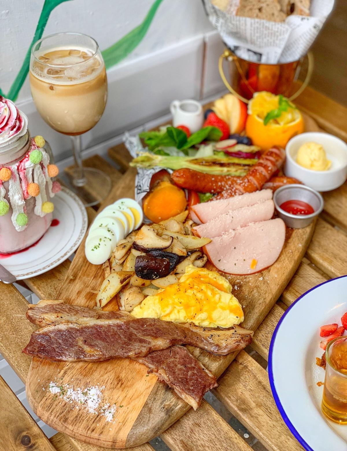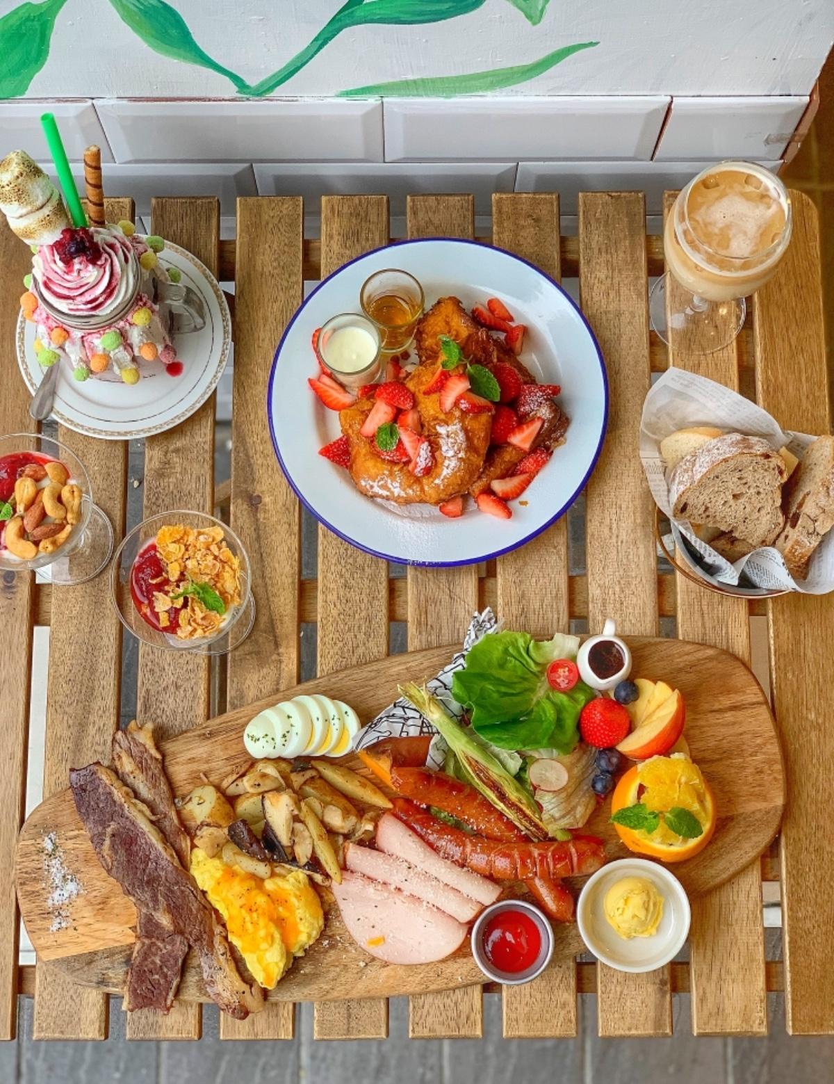 2⃣️人份的早午餐 豪華又吃得超飽 隨便算ㄧ下食材都超過10種 這樣吃真的好划算 選了牛排當主食軟嫩夠味 有炒蛋水煮蛋 地瓜鮮甜綿密 德式香腸 煙燻火腿也給好給滿 再附上沙拉水果麵包 兩杯優格 真的好過癮!拼盤食材會隨季節更換