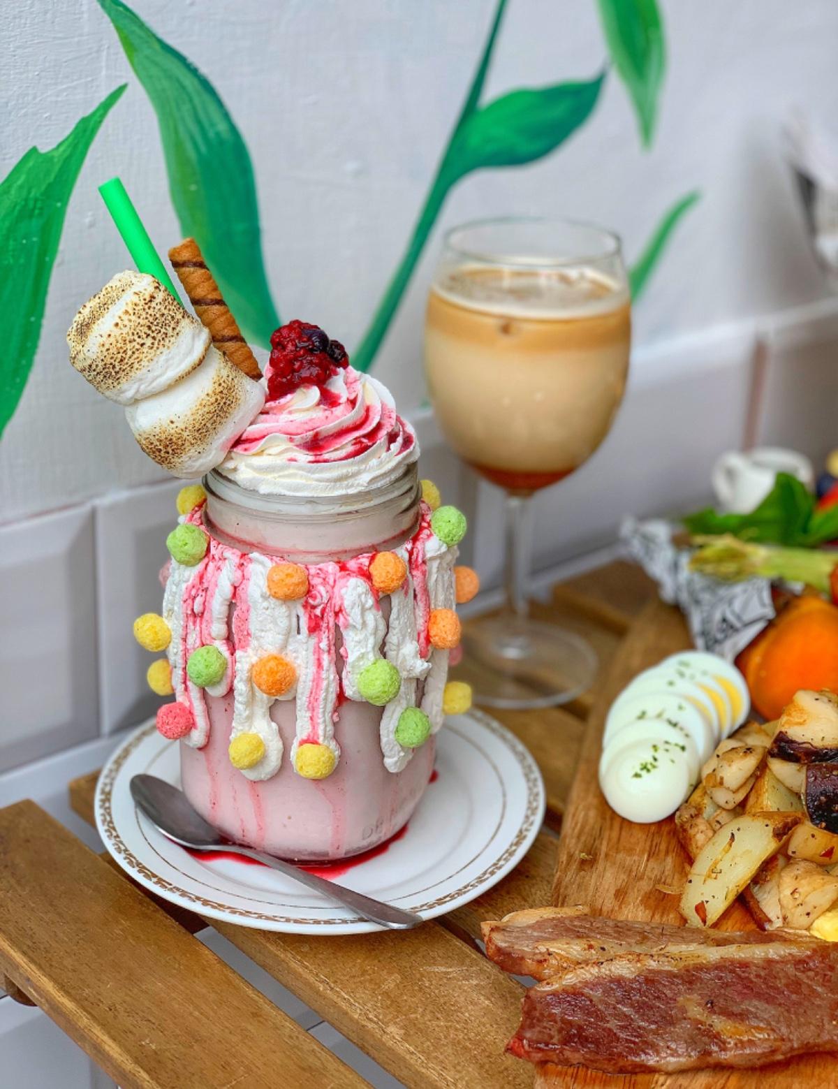 浮誇的草莓奶昔 濃郁香甜 上頭有滿滿的鮮奶油 攪拌均勻喝 不會到太甜膩啊!
