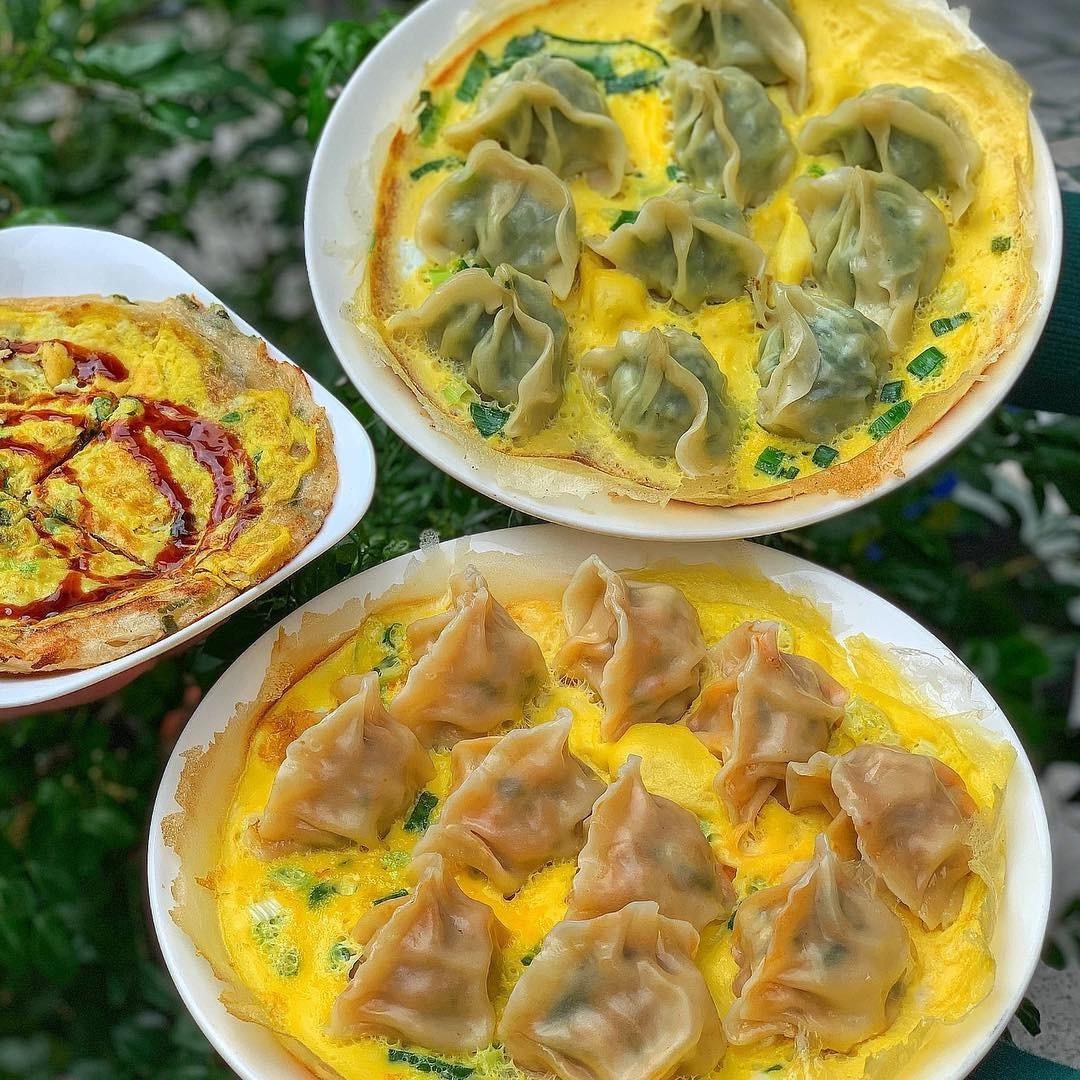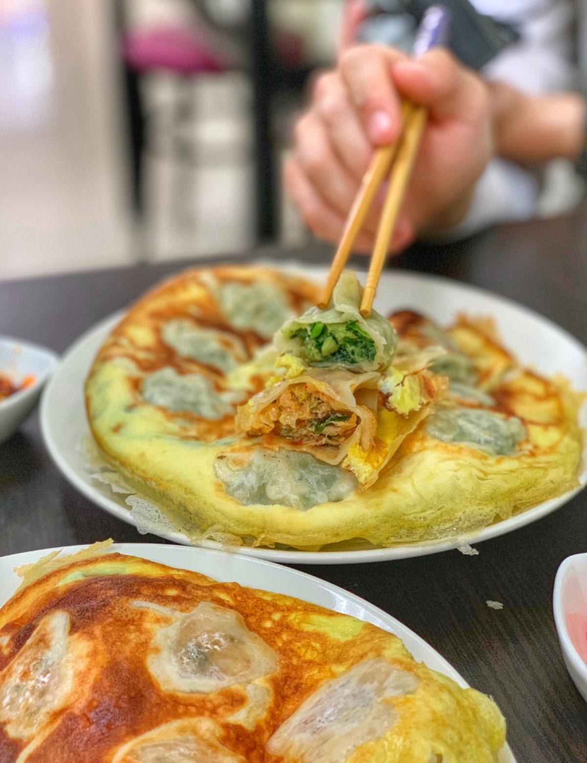 底部像冰花ㄧ樣 但!是蔥蛋 熱熱的吃會帶脆脆的口感 冷了吃會帶點Q彈 邊邊煎得恰恰的 很讚!韭菜口味較重 韓式泡菜不會太辣 很順口😻