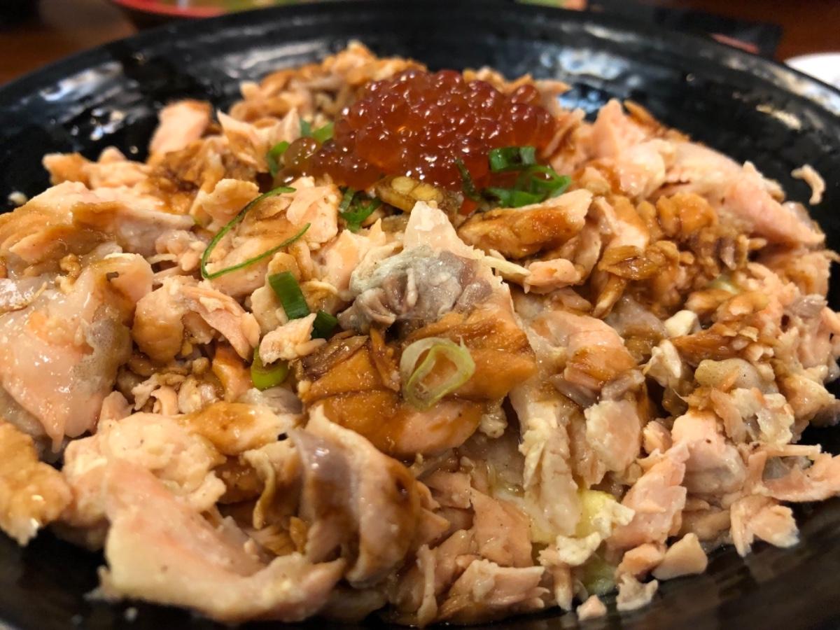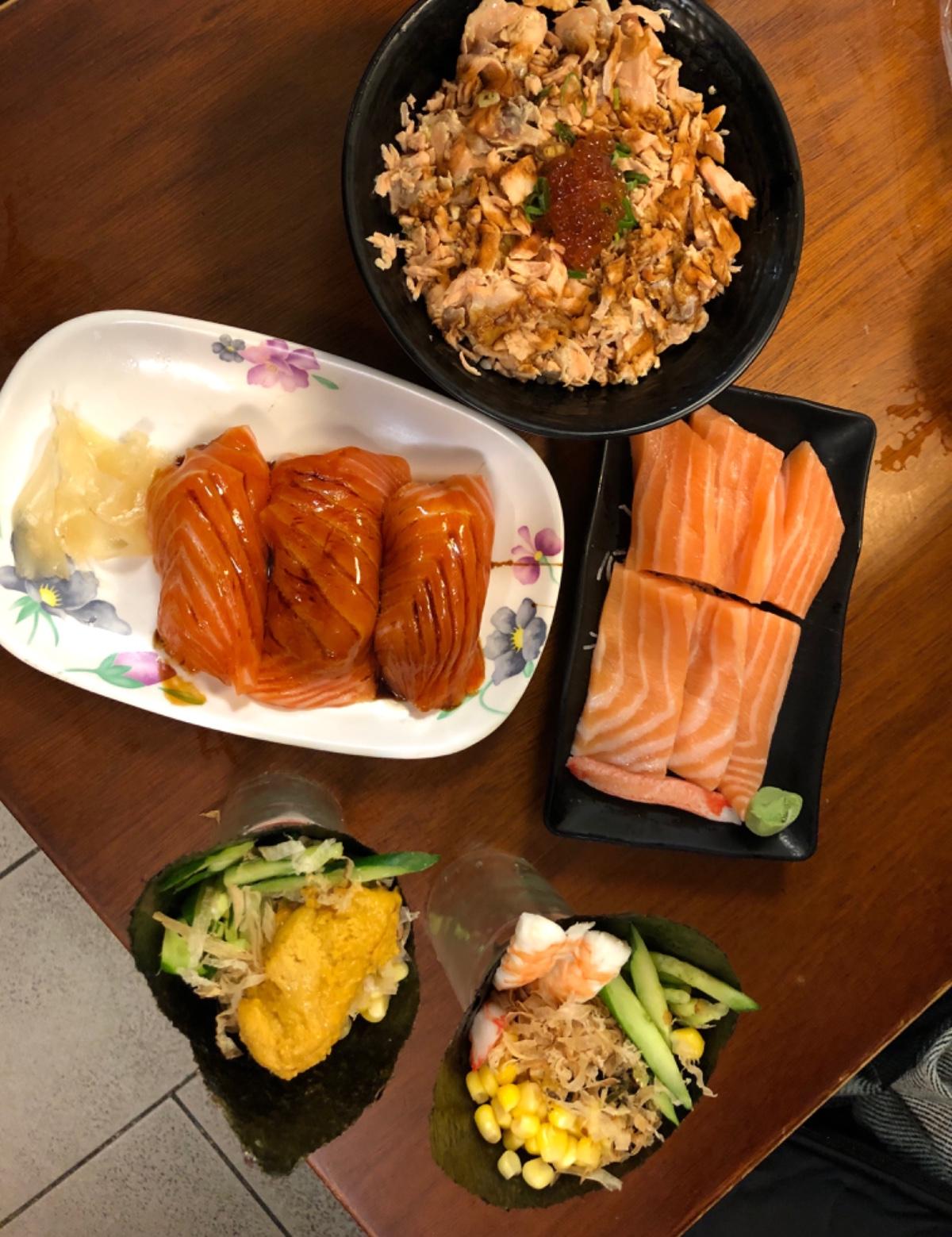 2.鮭魚肚很厚,吃的時候被油花給嚇到,其實是好吃的但如果可以再切薄一點會比較可以接受,一定要自己帶無糖冰茶解膩😅😅3.鮭魚滷肉飯裡面是熟的鮭魚和散蛋,上面的鮭魚卵蠻鹹的很下飯,這道是我最喜歡的!