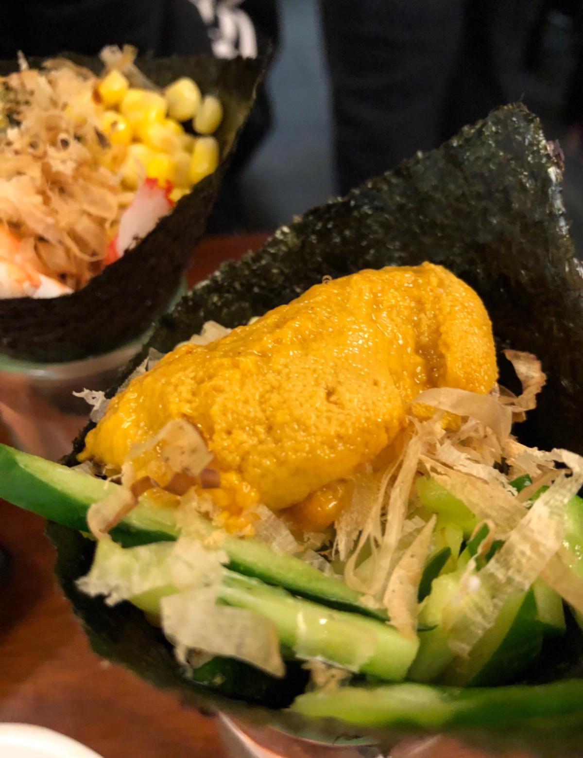 4.海膽手卷個人不是很喜歡,吃起來像鹹鹹的果醬,不配其他東西吃不下去😭