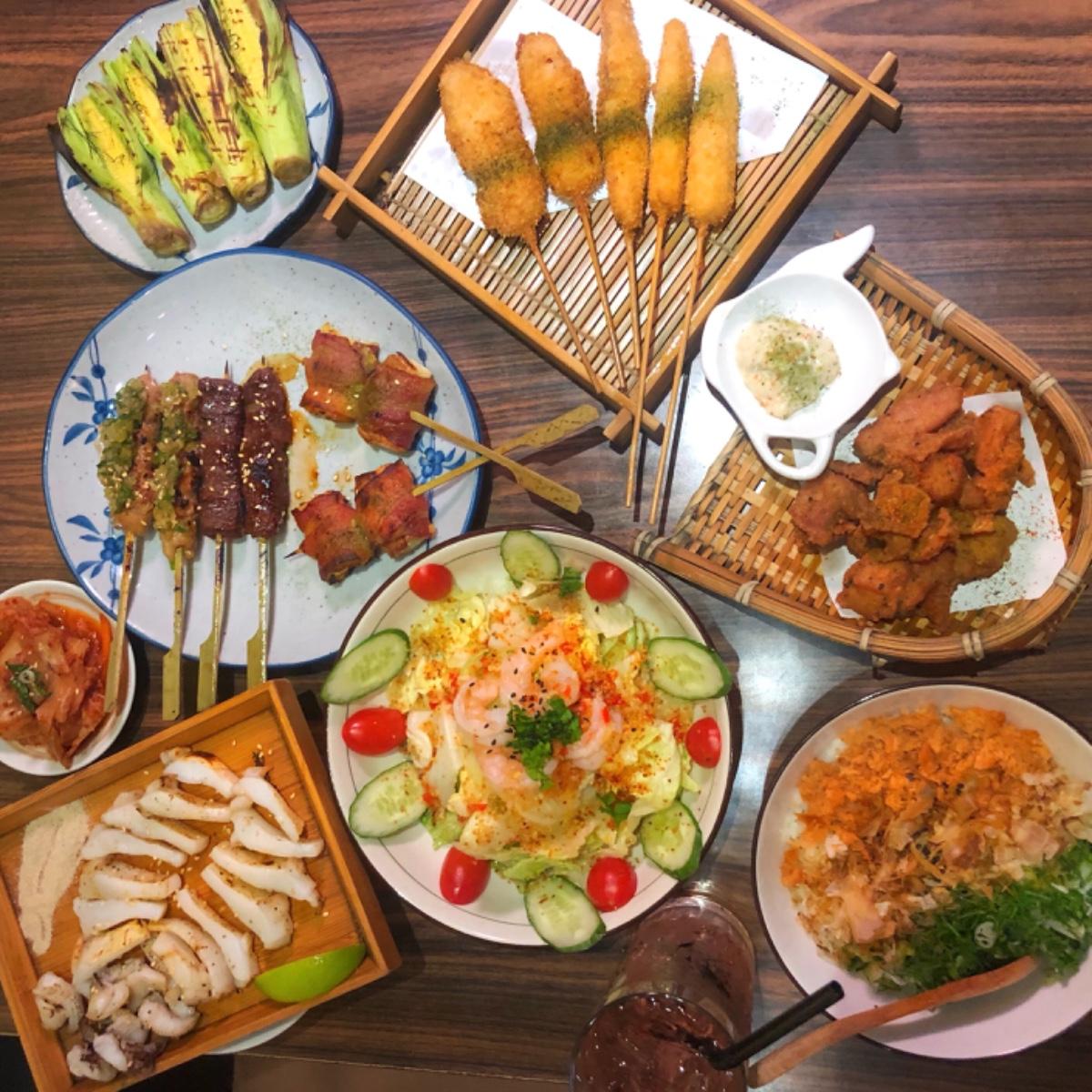 泰式鮮蝦沙拉、帶皮玉米筍、006炸子雞、喵飯、三種小確幸(鹽蔥雞腿肉 、培根捲霜降吐司、醬烤招牌和牛串)、遠洋花枝、五種大滿足(雪花起司牛、豚菲力、雞腿肉、鯛魚、玉米筍)、巨峰紫葡萄沙瓦、荔枝沙瓦