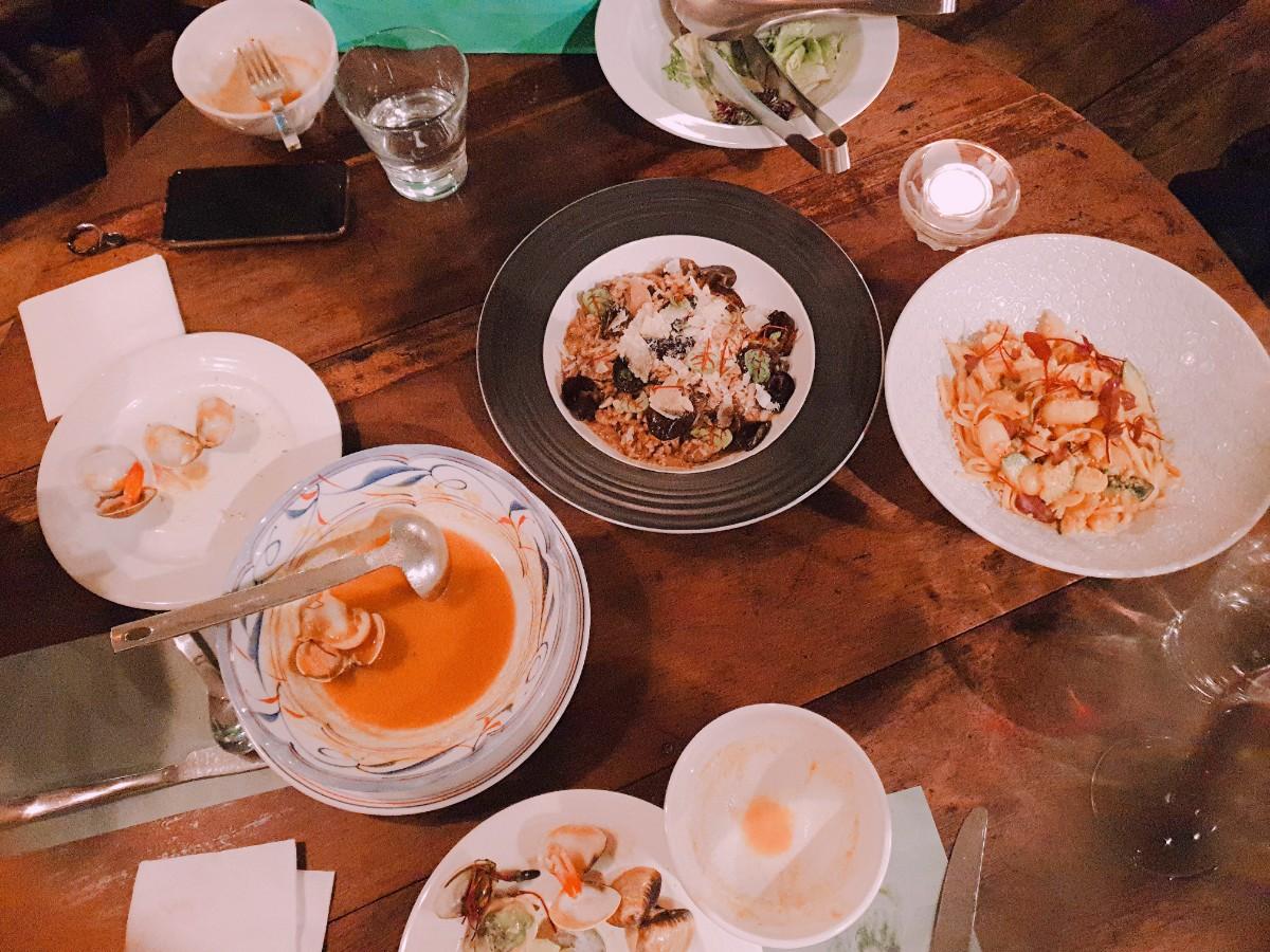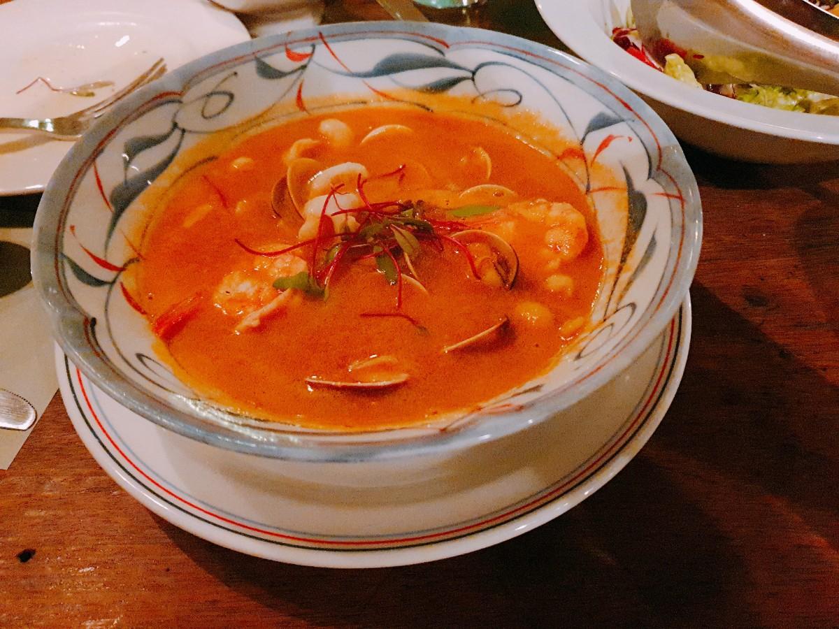 煨煮香草蝦汁海鮮湯-以蝦和蔬菜熬煮的湯底,濃郁又清爽,滿滿的蛤蜊.花枝,充滿大海的鮮甜。