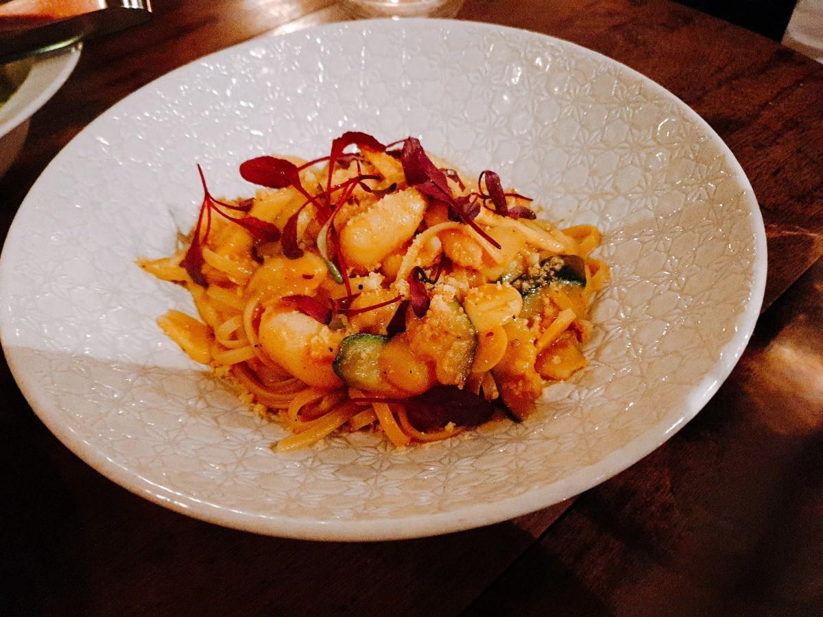 蒜香蝦汁蟹腿肉蔬菜細扁麵-把所有海鮮精華濃縮到細扁麵裡,彈牙的口感,吃的到蟹腿肉的鮮美。