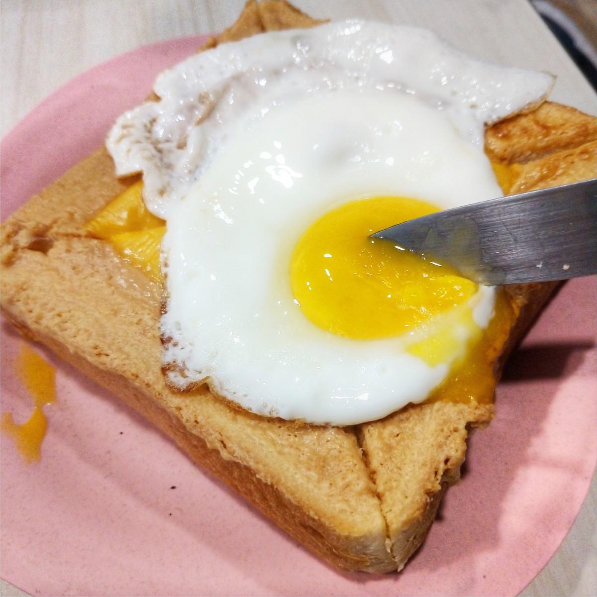 老闆完全不馬虎的將花生醬塗滿整個厚片吐司,上面放一片半熟蛋,叉子切下伴隨蛋液傾瀉而下,增添了吐司的滑嫩口感,是特別的點心早餐~