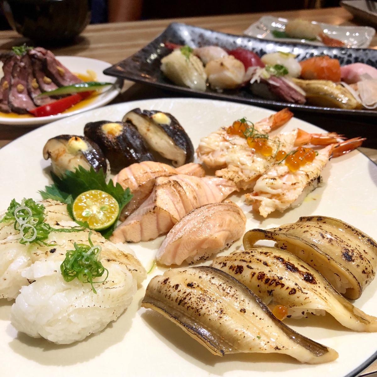 炙燒握壽司:比目魚、干貝、牛肉、星鰻、鮭魚肚 。