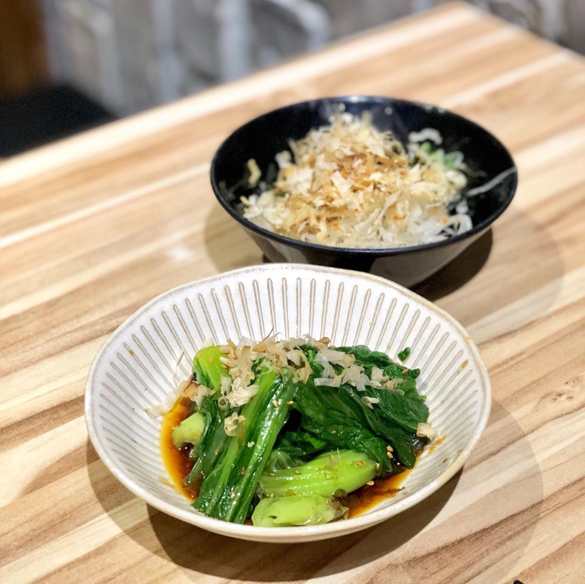 時蔬淋上的是胡麻醬、芥蘭加了芥末子會有點嗆嗆的,洋蔥不辛辣偏酸,三種都是好吃的小菜!