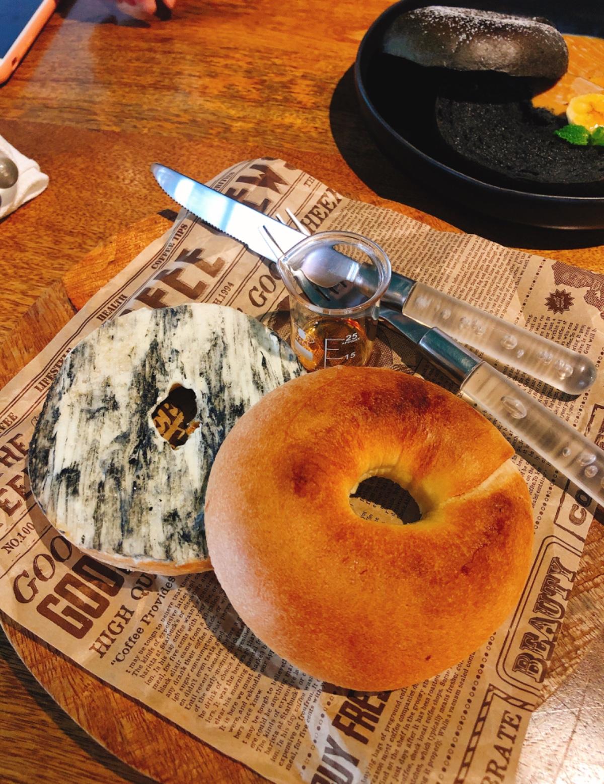 大理石起司貝果 X 光線極美的文青咖啡廳 貝果酥酥的好好吃,原來大理石是奶油醬🤣 訂位的時候記得要敲好窗邊的位子 因為光線真的太美了🥺 沒有坐到窗邊的位置,飲恨🥺🥺