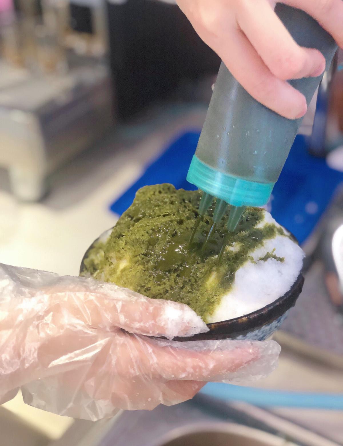 使用台灣抹茶🍵居然濃到嚇死人!一口吃下去完全是苦抹還有抹茶的粉感,喜歡吃抹茶的人一定都會愛💚,而且醬整個加不用錢欸淋好淋滿,內餡還有放店家自己做的豆漿麻糬,感覺像打了7749天一樣軟爛又Q超好吃的啊啊啊🤤,奧斯卡說豆漿味很濃但是會不會嘴裡都是抹茶味我居然吃不出來😭,上面淋的是海鹽奶蓋,灑上抹茶粉又苦又有鹹,旁邊附的白玉也超軟Q像在吃麻糬一樣😍,配料還在更動所以之後不確定還是不是白玉,冰做成這種程度誇張死了