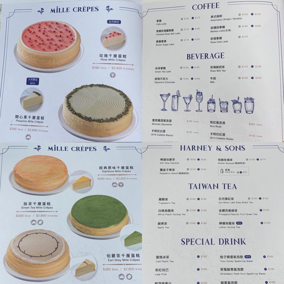 這次和朋友一起來點了兩片千層 分別是:伯爵茶千層蛋糕$280/單片 和 開心果千層蛋糕$280/單片 口味如何我就不細說了 但我覺得品質對得起一片$280的價格🤣🤣(有說和沒說一樣哈哈哈哈)要我來第二次大概是不太可能了 除非有人請客🥺 菜單附在附圖上了 但因為張數的問題所以組合起來 看不清楚的話抱歉了嗚嗚嗚