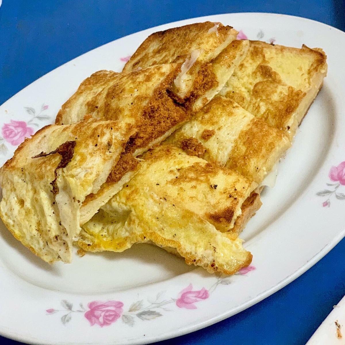 還點了法國吐司及豆漿,法國吐司夾肉鬆抹美乃滋,煎的金黃酥香很古早味,豆漿是有點焦味那種可惜甜度固定。