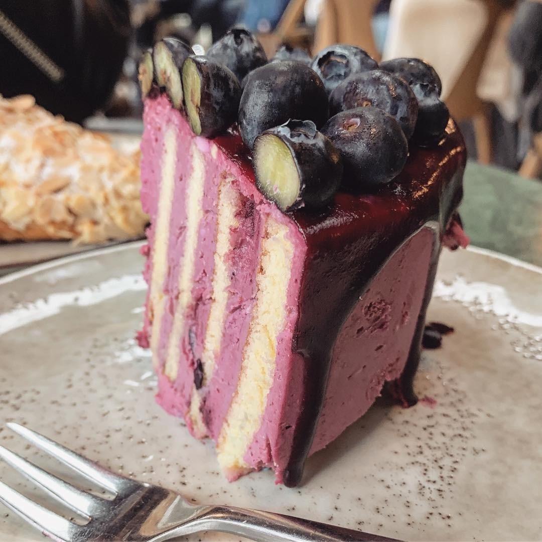 藍莓乳酪夾心蛋糕🍰 像是小巧精緻的珠寶盒,一顆顆藍紫色藍莓在頂端綴飾、莓果乳酪滲入蛋糕體;紮實鬆厚、藍莓果醬與莓果乳酪酸甜爽口莓香馥溢,就像來到了漿果園