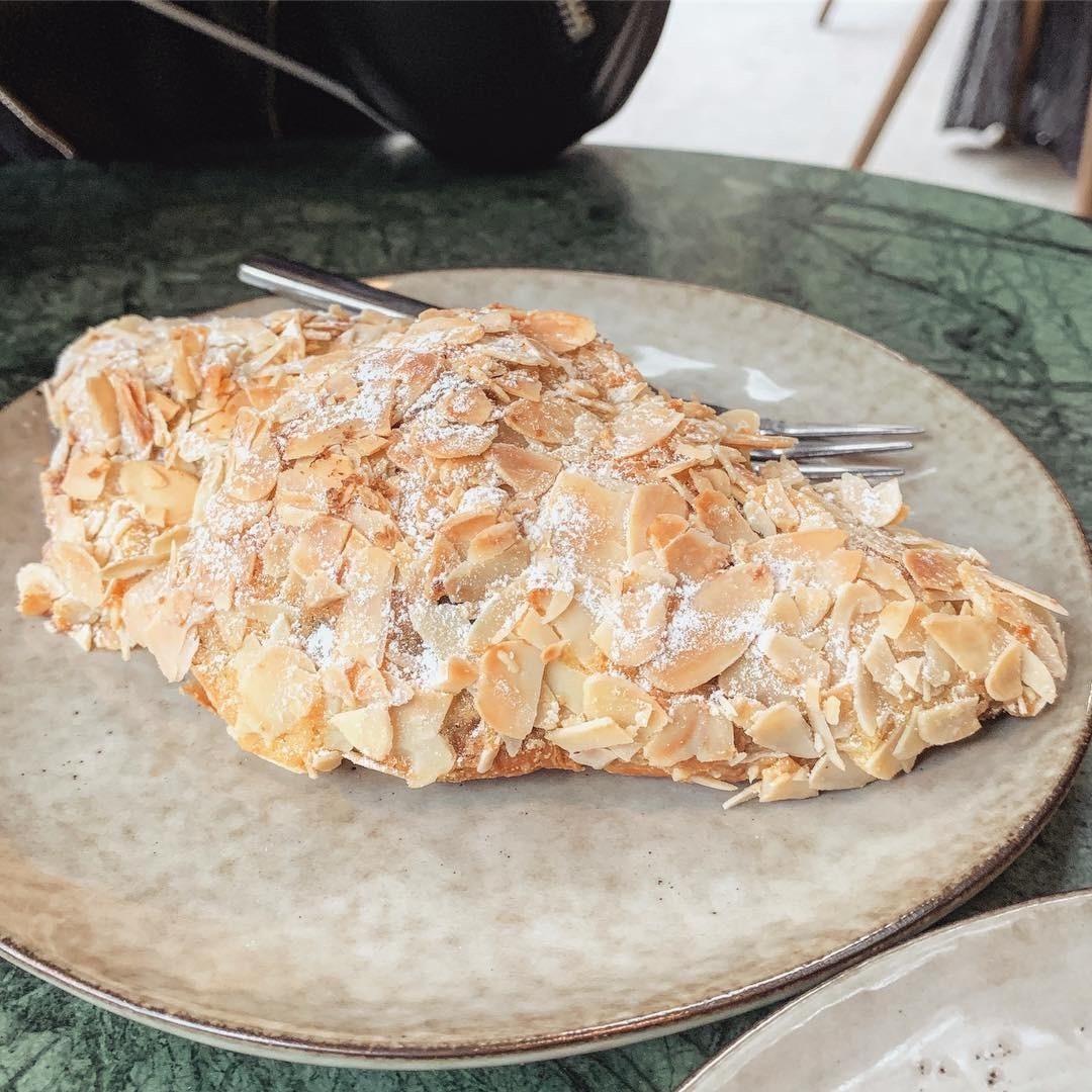 杏仁可頌🥐 滿滿的淺焦糖色杏仁片上灑了細緻的糖分,幽幽的杏仁香氣撲鼻引入趕緊品嚐;咬下一口,發現其中有著驚喜!裡邊的椰香奶酥餡襯托的分明層次,乾爽、酥香、輕盈,一改我對可頌有很油的既定印象,杏仁控如我對它也是念念不忘🤧