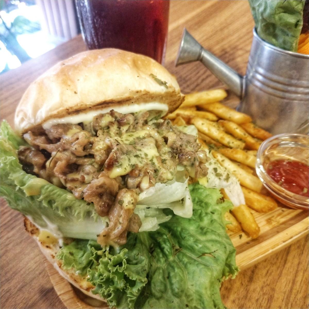 各位看這張照片就知道了,雪花牛肉片超多~送上桌的時候看到滿滿的肉覺得好開心呀😍漢堡裡搭配蜂蜜芥末醬很合,不會過於搶戲卻提味,旁邊的沙拉裝在澆水器也超可愛又美味!薯條跟紅茶表現平平
