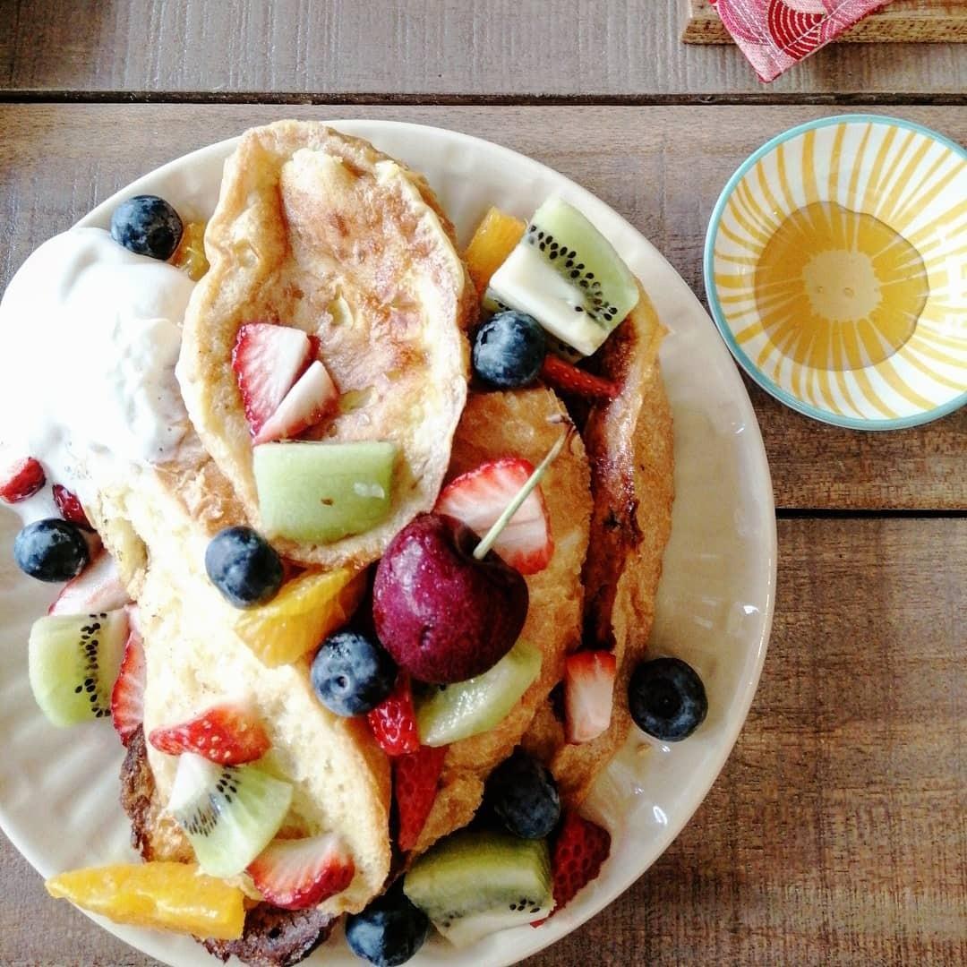 吸滿蛋液,有點外酥內軟,還搭配許多水果