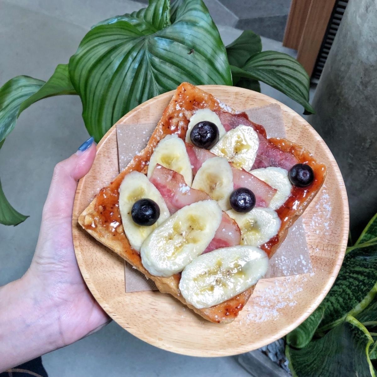上面有香蕉、藍莓、培根的厚片,果醬一半草莓一半花生,還有點顆粒,吃到花生果醬的瞬間其他味道直接不見了,連培根🥓的鹹味都吃不到😂 我覺得這搭配有點詭異,怎麼會有培根啊