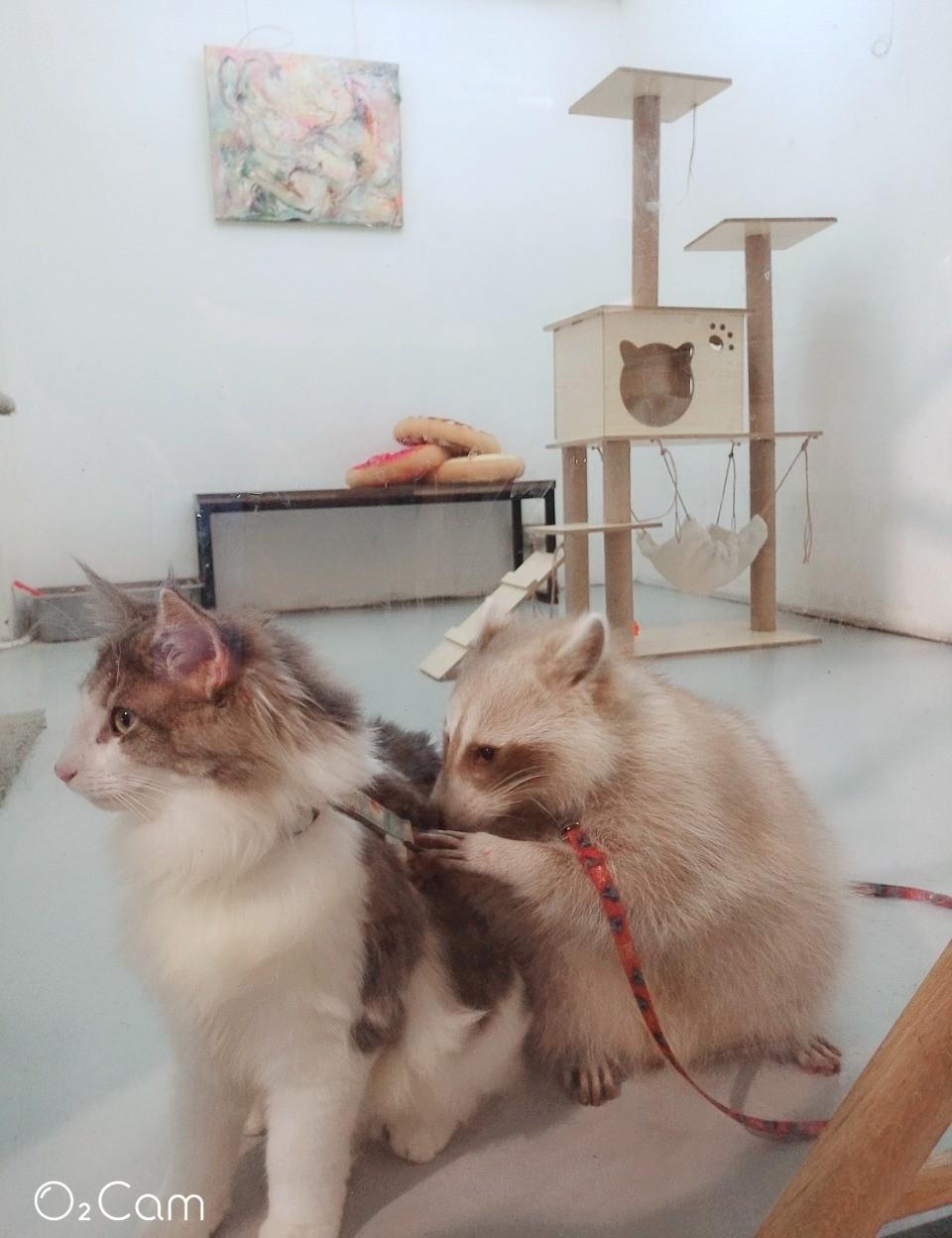 咖啡廳環境舒服 還有可愛的浣熊跟貓咪 如果要互動請記得到臉書粉絲團預約 並遵守規則喔!可以自備口罩或現場買(一個10元)飲料以咖啡居多 熱飲換成冷的要加10元 另外咖哩飯的雞肉很嫩~~~