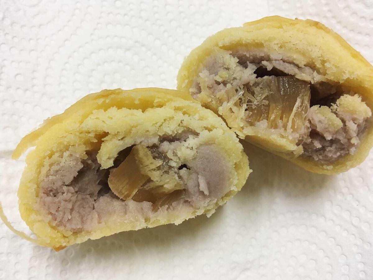 🥮菠蘿干貝芋泥酥-外層的菠蘿皮偏濕軟,所以太粗魯就會捏扁了喔!另外,芋泥+干貝其實不會很衝突,但是烏鴉覺得單純的芋泥餡微微甜又綿密就很好吃,所以更喜歡分開的口味;不過干貝等級烏鴉媽很「額樂」喔!說品質不錯,烏鴉覺得跟自家買來煮湯的乾貨等級差不多,甘甜不會過鹹,滿好吃的👍🏻