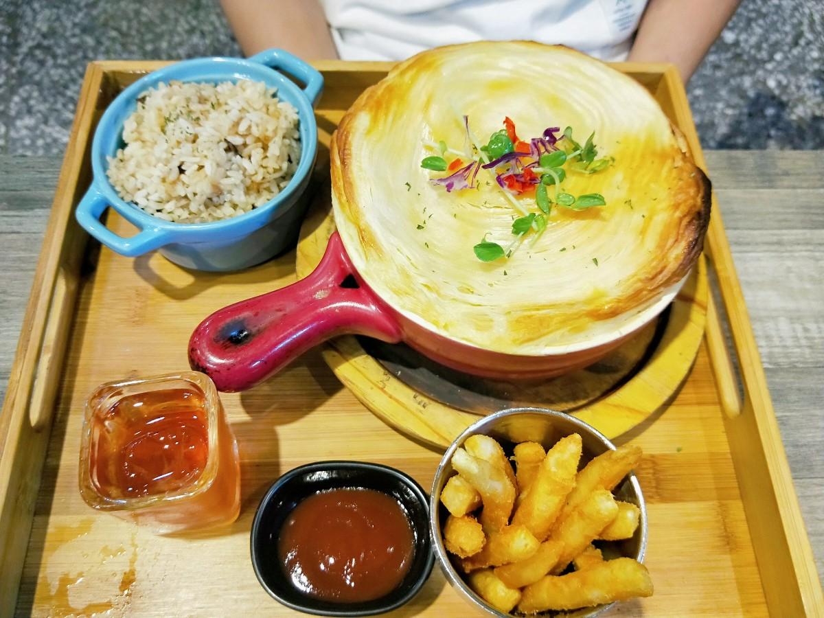 ✔有魚🐠有蝦酥皮濃湯(小碗五穀飯🍚➕又香又脆的薯條🍟,另外還有小杯的果醋🍸,解油膩,又好喝👍)